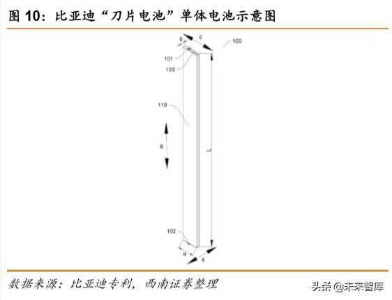 根据比亚迪专利中的描述,“刀片电池”是比亚迪新一代磷酸铁锂电池的一个名称,是比亚迪研发多年的“超级磷酸铁锂电池”。刀片电池实为比亚迪开发的长度大于等于600mm小于等于2500mm的单体电池,通过阵列的方式排布在一起,就像“刀片”一样插入到电池包里面。相比于比亚迪此前的磷酸铁锂电池,“刀片电池”的升级重点在于可实现无模组,直接集成为电池包(即CTP技术)。刀片电池包通过优化电池包结构,从而提高电池包之后的效率,但对单体能量密度提高没有太大影响。