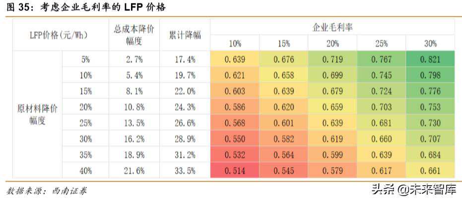 3)进一步假设原材料(包含正极、负极、隔膜、电解液、铜箔、甲基、电池箱)价格降幅20%