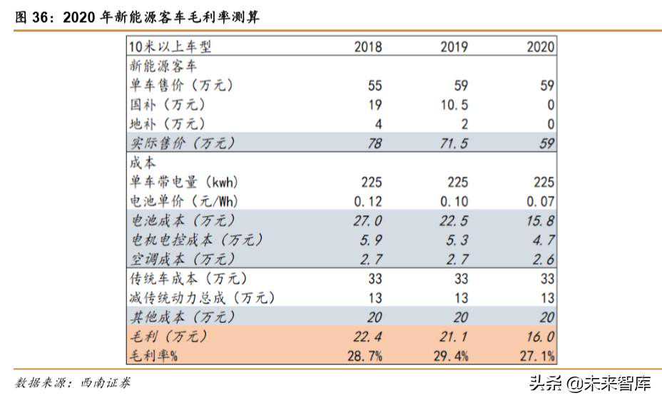 基于2019年已经有很多一线整机厂采用CTP的方案进行上车测试,所以预计2020年会于一部分的车型开始采用该技术。我们按照上文的假设,以10米以上的车型进行测算,电池成本降低30%,则电池成本从22.5万降低到15.8万,在没有补贴的情况下,毛利率可以维持。