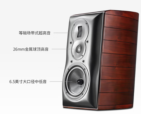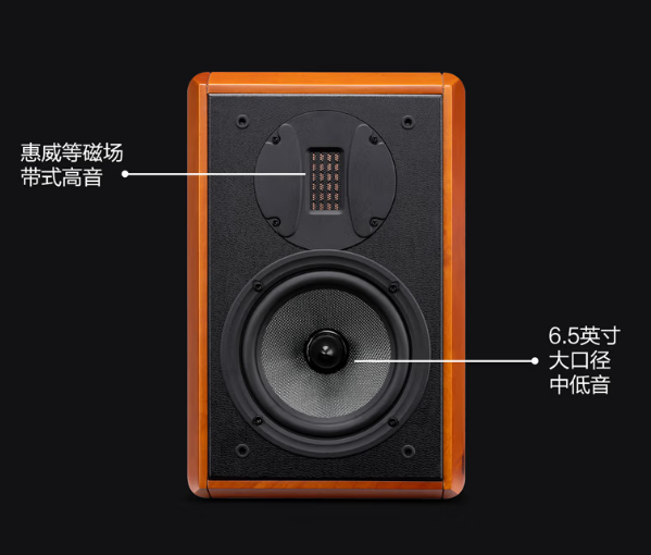 在单元配置和电声设计方面,M803A采用了双高音组合加6.5英寸大口径中低音的创新三分频设计。其中,超高音单元为惠威顶级等磁场带式超高音,采用轻薄Kapton材料涂敷金属铜箔线圈,振动质量更轻,瞬态特性远超传统高音单元,频率响应可轻松延伸至20kHz,减少了声音的失真和频率响应的不均匀度,使得声音准确、干净;而26mm的金属球顶高音单元则采用了惠威特别优化设计的金属振膜,使其具备高解析力、低失真的优点,与超高音单元搭配可极大提升高频延伸上限和解析力,其声音明亮通透、细腻柔和,声场更加开阔自然。