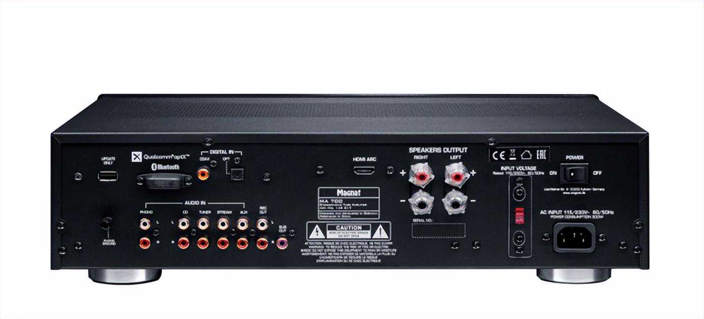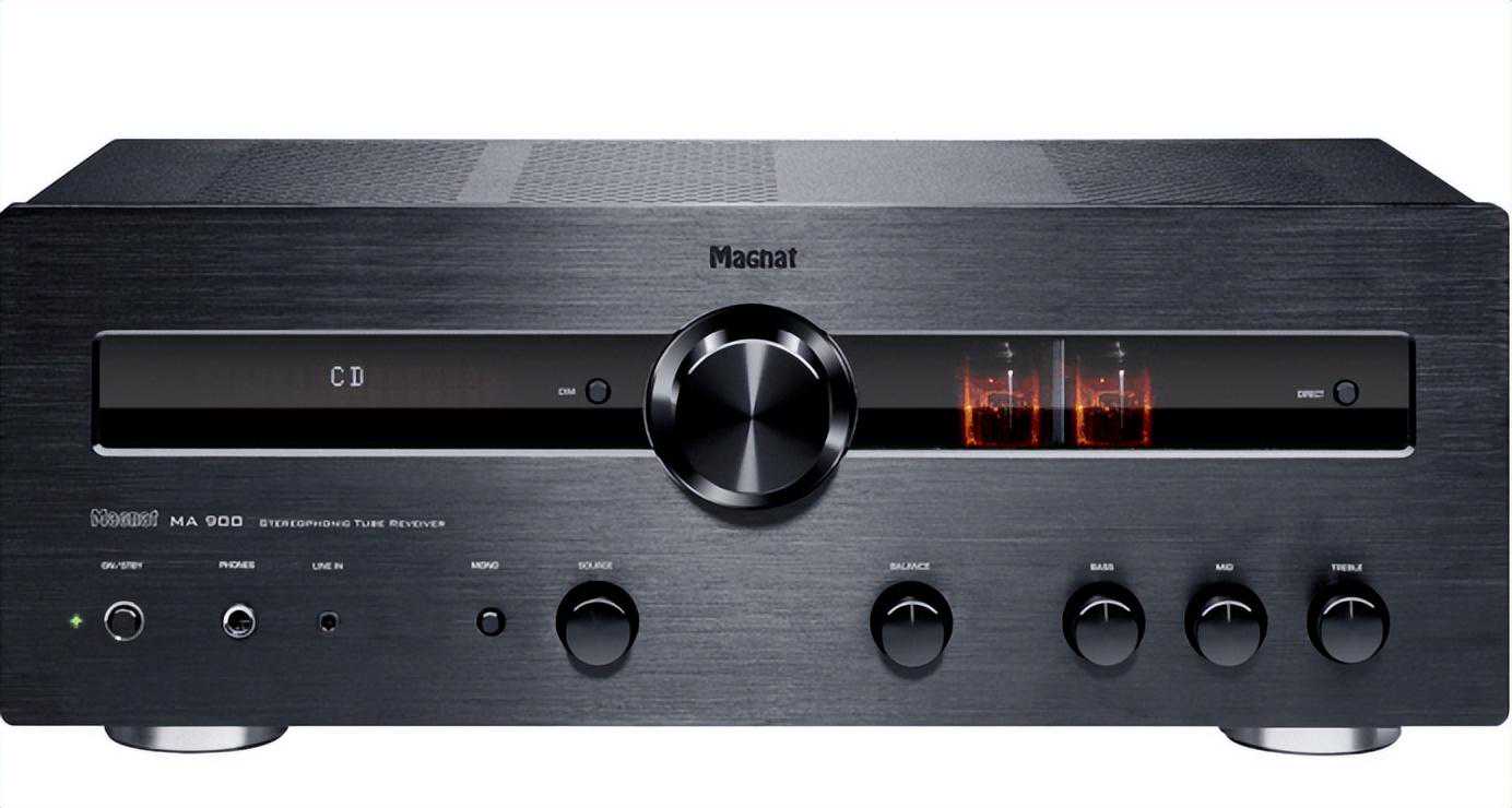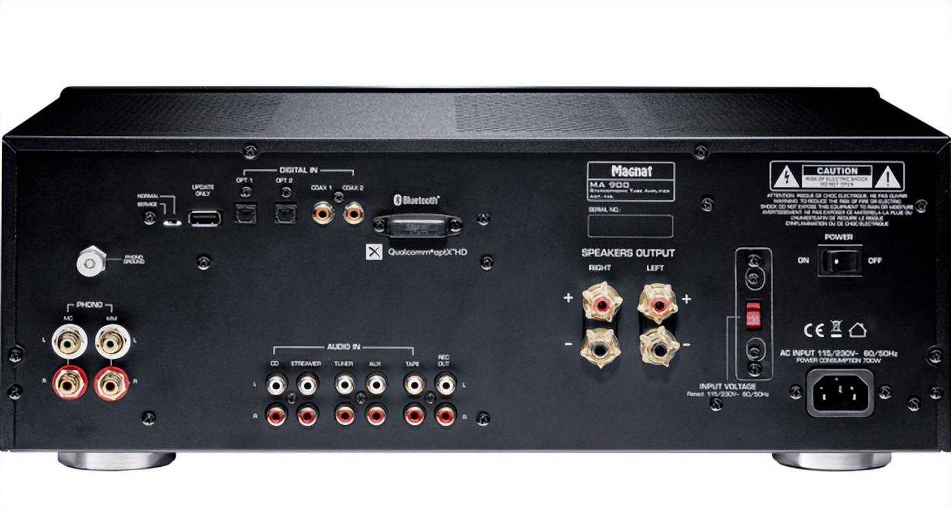 MA900是一台稳定输出,带电子管前级放大和高性能晶体管输出的混合式合并功放。前级放大部分采用两支来自俄罗斯的ECC-81电子管,确保整个系统提供温暖而细腻的声音表现。MA900功率方面在4Ω负载下每声道输出为200W,8Ω负载下则为130W。前面板则有一个3.5mm输入,用于连接便携设备,以及一个6.3mm耳机输出,这些配置都很好地保证了最广泛的聆听需求,包括平板电脑、智能手机和电脑也可以通过蓝牙5.0连接,支持aptXHD,采样频率高达24Bit/192kHz的数字输入。MA900配置了5组高级RCA输入,1组带唱放和地线的RCA输入,1组前级输出,2个Optical光纤以及2个Coaxial同轴输入,1个电脑USB输入,还自带蓝牙适配器以及一个用于MM和MC系统的唱机输入。