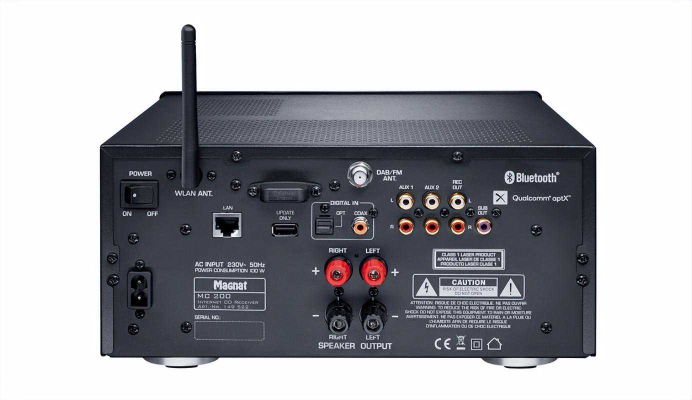 满足了用家对于功放和CD播放功能的需求,全金属外壳,配以前面板的坚固铝材制作,加上拉丝处理后,视觉效果和质感一流。MC200具备CD唱片读碟功能、无线蓝牙传输(4.1)、FM\DAB+和耳机放大器和网络串流等功能。用户更可以通过MAGNATSTREAMINGApp实现更多的操作(如多房间音频、串流访问和流媒体播放等)。电源配置上,MC200采用了Hi-Fi级别的环形变压器,并且经过磁屏蔽处理,输出功率为35W×2(20Hz~20kHz,THD<1.0%,4Ω负载),峰值输出更可达到75W×2。功能上,MC200支持Hi-Res24bit/192kHz音频码流和档案,通过小巧的MC200能让你感受到优于CD质量的高分辨无损音质的魅力。其中流媒体播放包括Spotify和InternetRadio。而串流访问则可以通过MC200访问家中网络存储设备(NAS)中的音乐档案。MC200额定每声道输出功率为35W(4Ω),峰值功率输出高达75W。同时也具备低音炮的输出连接,方便用户搭配2.1系统。输入端方面,MC200配备2组RCA、1组前置3.5mm(可用于连接随身听)以及光纤和同轴的数字端和LAN网络端。