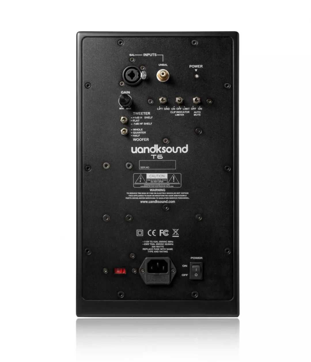 在背面板上,调节的功能比T4来得更加丰富,输入接口方面有平衡BAL和非平衡RCA的输入,其中BAL用到了瑞士纽曲克Neutrik的制品,可见用料毫不妥协。T6同样具备音量增益旋钮,在下方具备高音的增益调节,低音上具备全周、1/4周和半周相位设定。与T4相同,T6可以调节LIFT浮地接驳和GND接地功能,CLIP削波、LIMITER限幅、INDICATOR指示器、静音功能。