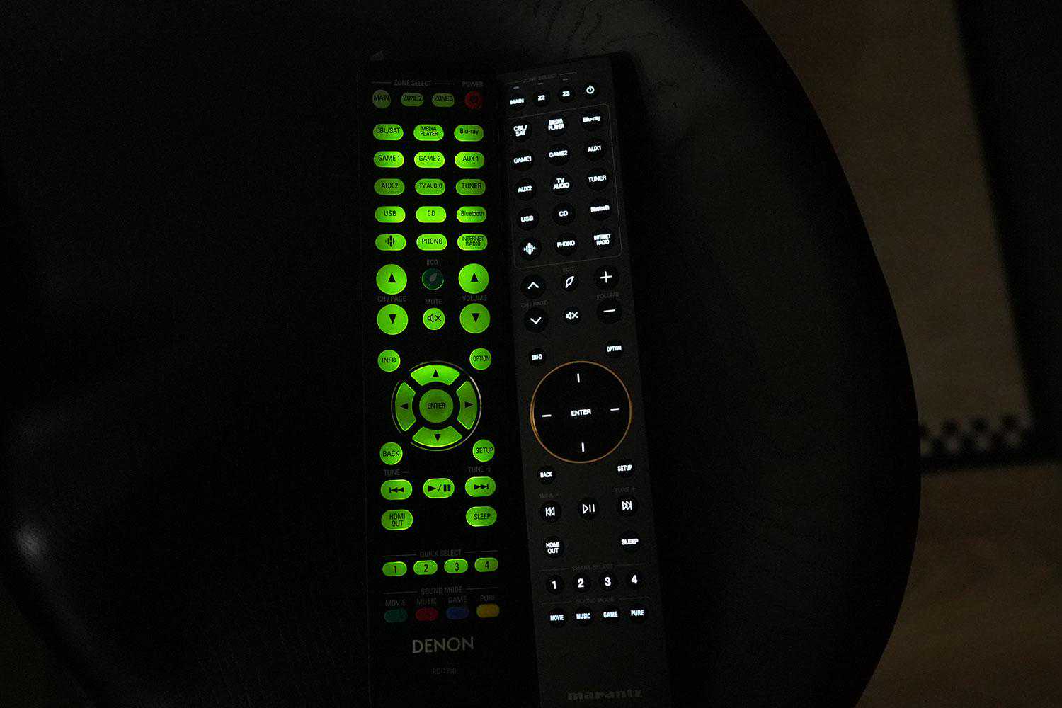 如果是在夜光模式下,Cinema遥控的质感更是完爆天龙的。其实天龙功放外观挺好,但遥控器确实应该改改了。A1H是配得上A1的名号的,但这个遥控器是真心配不上。