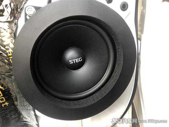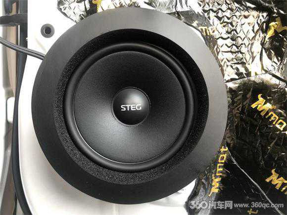 在前声场喇叭安装意大利史泰格MT650C喇叭,这款喇叭中低音喇叭单元采用的是STEG定制的低谐振高刚性铝盆架,超大磁路驱动,保证大动态下不失真,高音单元的外观非常精致,外表是CNC高光处理的铝架,核心部件是28mm丝膜球顶振膜,使得它的解析力非常高,而且声音明亮而贵气感足。改装师将中低音单元安装在汽车门板原位上。