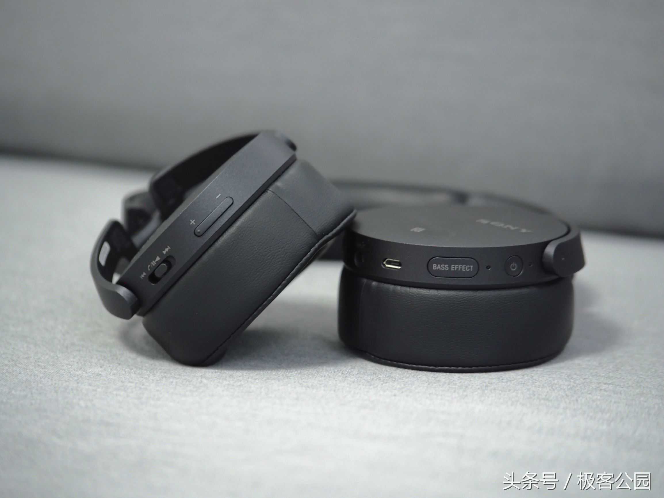 MDR-XB950N1的右侧是音量加减以及一个多功能控制按键(按下去是暂停/播放,左右掰是上一首/下一首),左侧有电源键、重低音键(BASSEFFECT)、MicroUSB充电接口、3.5毫米耳机插孔以及主动降噪开关,耳罩外侧还有一个NFC标志,可以通过NFC快速完成配对。