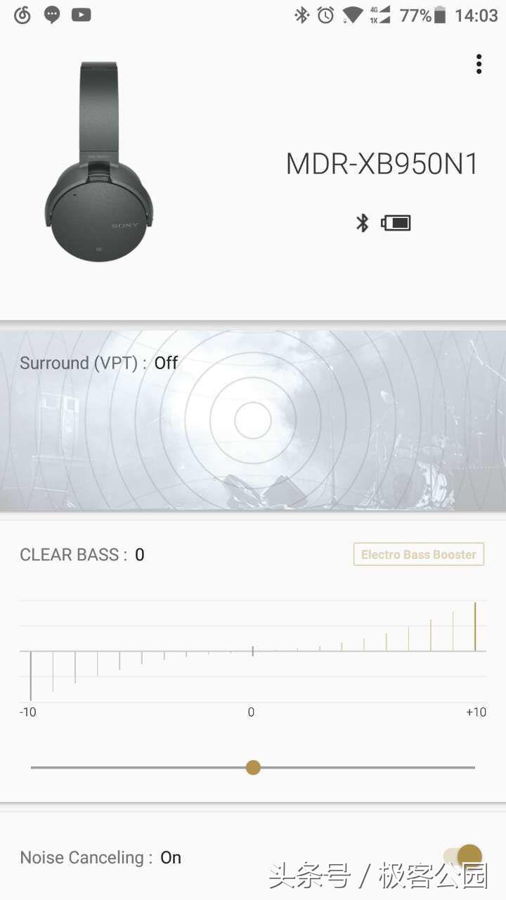 此外,索尼还为MDR-XB950N1准备了一个叫做SonyHeadphonesConnect的app,我们可以在这个app中调节重低音的级别(-10到+10之间,效果下文会详说),开关主动降噪功能。