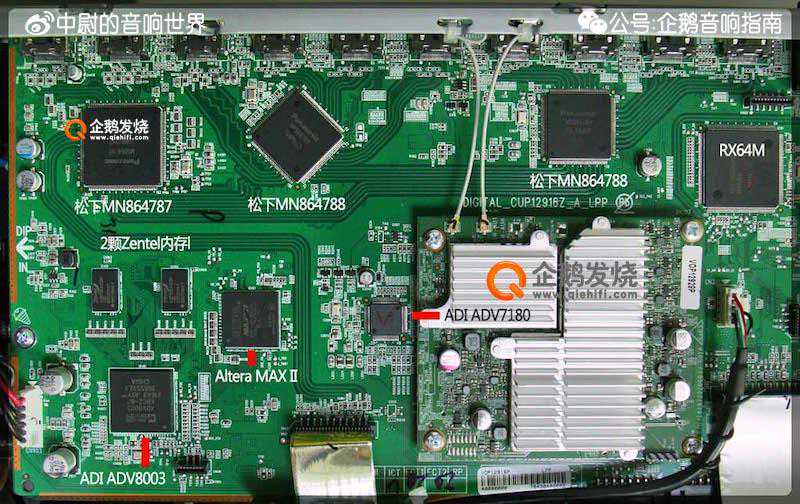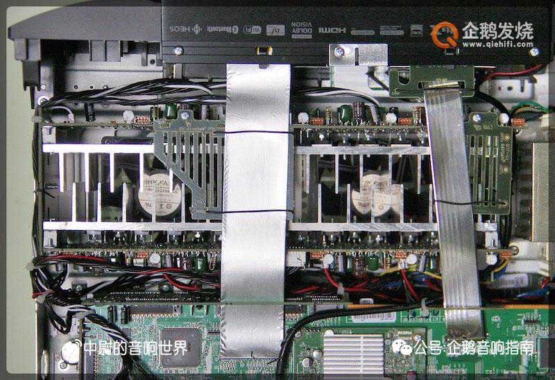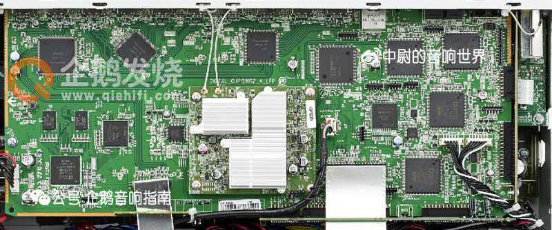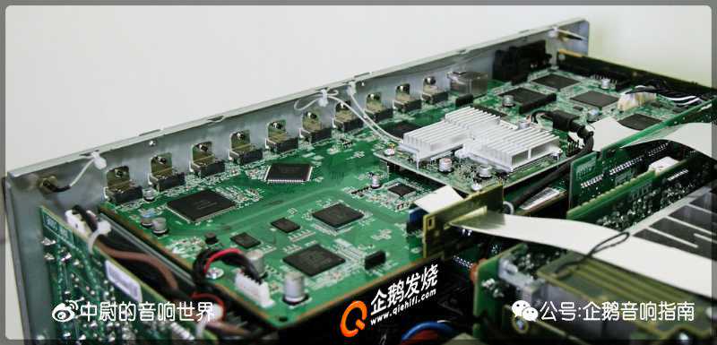 AV功放电路,基本就是四大部分:供电、解码、前级、后级。因为AV功放的结构比HiFi功放要复杂的多,大部分合并机都只能看到解码电路板,前级和后级电路很难看清楚。先放一张整体的俯视图: