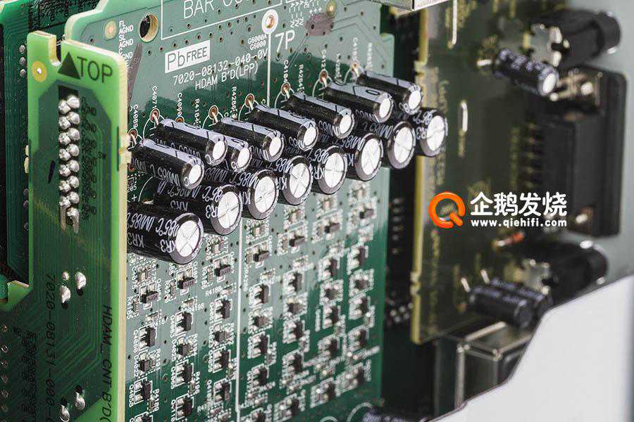 右侧电路板上最显眼的就是4颗ADI公司的ADSP21487。虽然DSP并不能决定最终的音质表现——在很大程度上前后级电路对音质的影响更为明显,但解码电路奠定了声场的分离度、环绕效果的连贯感等,而且还要负责Audyssey系统的海量运算,因此说它是整台功放的大脑也不算过分。而且这部分电路也是进化最快、最能代表AV功放主流技术。
