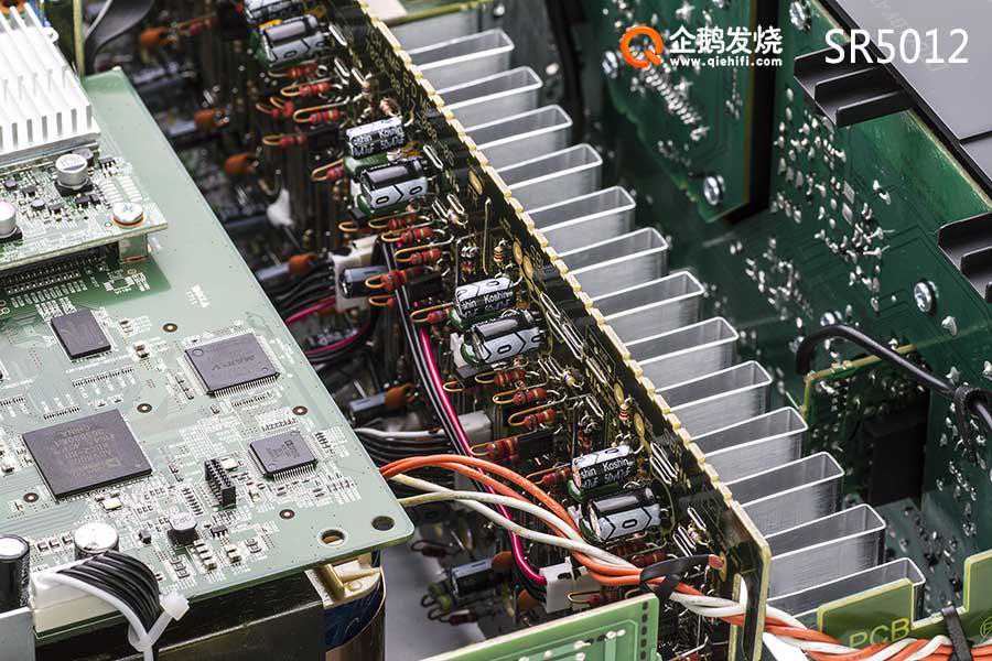 SR5012与SR6012虽然是产品线上相邻的两款功放,但内部布局显然不同。SR5012的进深比SR6012明显短了一些。机箱内的散热片也明显不同。SR5012只有7个声道,一组大型散热片;SR6012有11个声道,1组散热片空间不够,所以分成了两组散热片。而且,SR6012散热鳍片也要厚实的多,在散热片底部还有两只温控风扇,防止机内温度过高。而SR5012内部没有散热风扇。