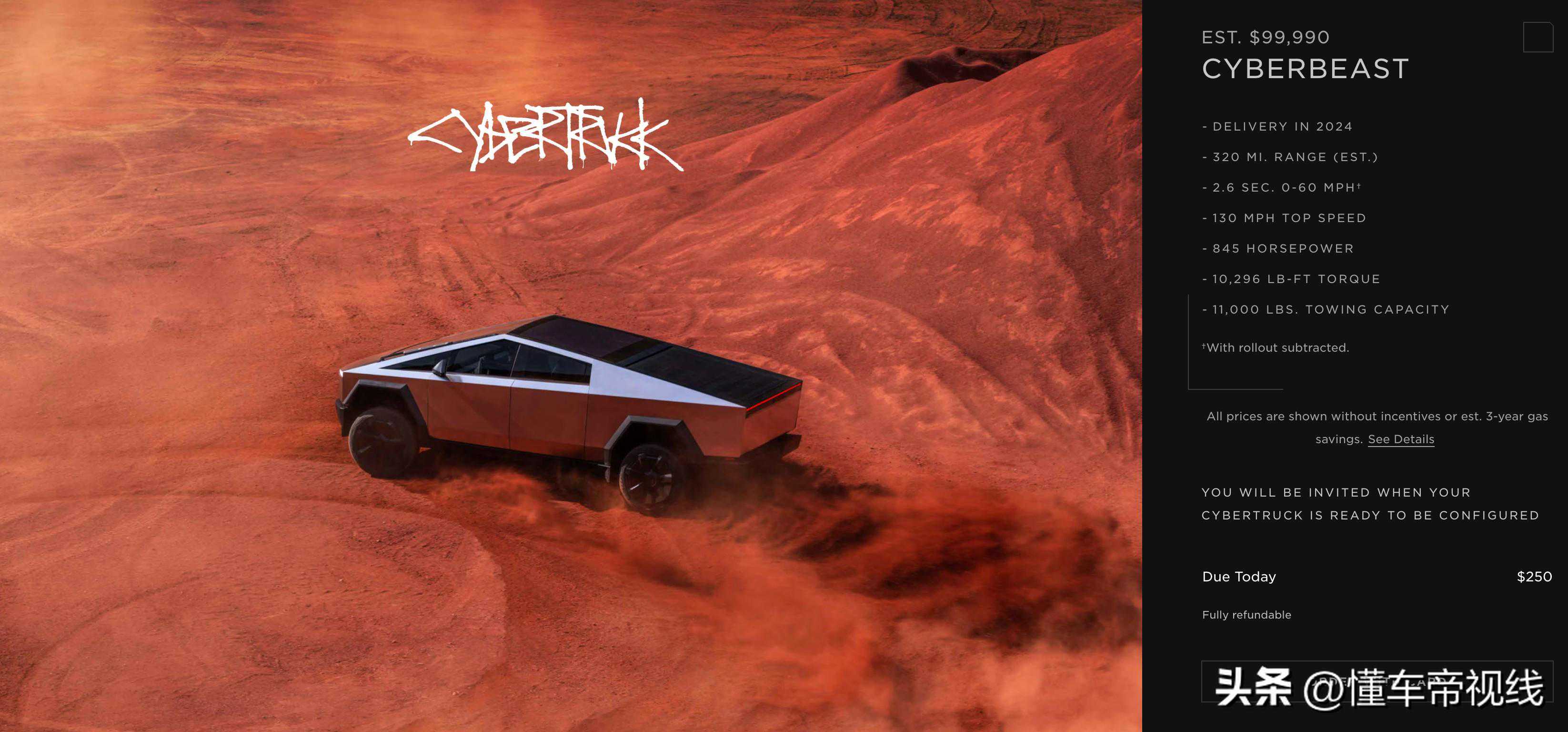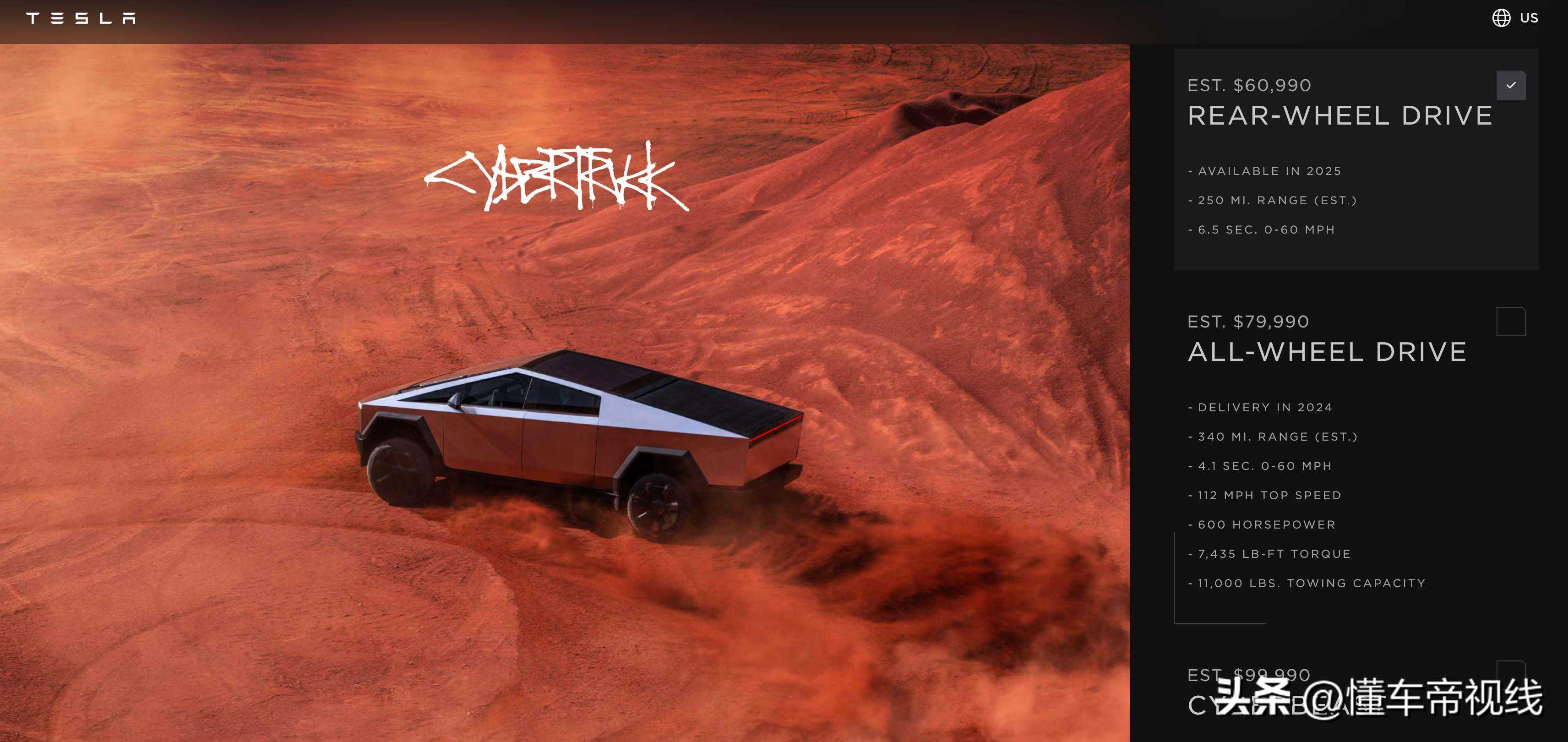 与此同时,特斯拉美国官网更新了Cybertruck的正式售价,后驱版售价为60990美元(约合人民币43.52万元),四驱版售价为79990美元(约合人民币57.08万元),赛博野兽(三电机版)售价为99990美元(约合人民币71.35万元)。其中,后驱版将于2025年上市,而四驱版和赛博野兽版则将于2024年开始交付。