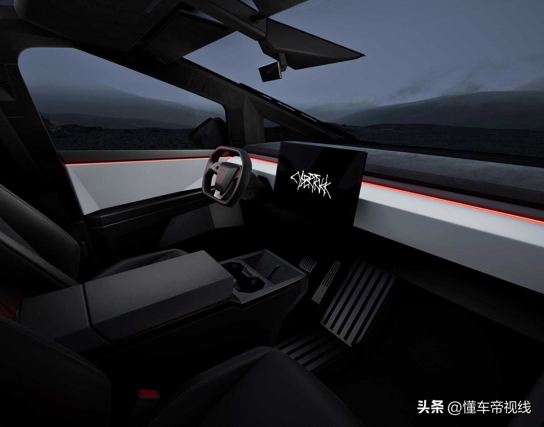 Cybertruck车内采用了极简风格设计,前排配备18.5英寸中控大屏,采用全新造型的方向盘,该方向盘看起来有些像Yoke方向盘的改进版,采用了多边形设计,多功能按键布局则与Yoke方向盘保持一致。同时,车内也并没有配备换挡杆,同样需要通过中控屏完成换挡。