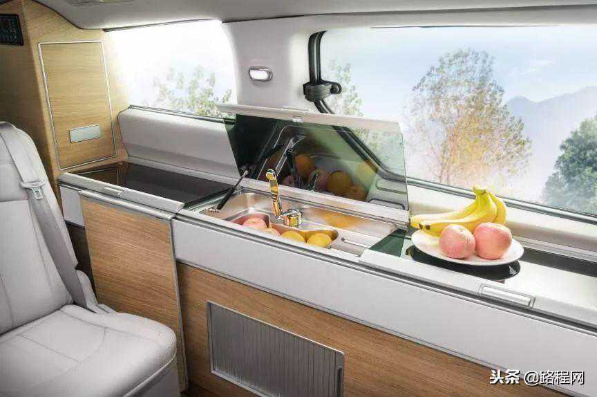 上汽大通RG10房车内部,温馨舒适的内饰给人一种家的感觉。不论是厨房用具,还是一键电动升顶、双床四卧位、营地级水电口、隐私着色玻璃,甚至是高端房车集成加热卫浴系统等等一应俱全。在沙发里侧,配备了一排整体成型的柜子,依次是18升小冰箱,洗手池和储物柜,非常实用。不用时盖上盖板,上面还可以放置物品。