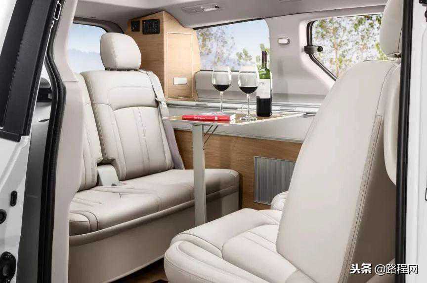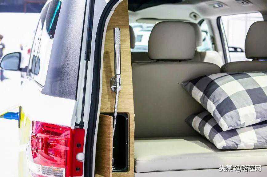 在车尾部还设置了外置淋浴,所以只要把车尾的围帘拉上,洗澡很方便。同时后方还可以放置一些行李物品,无论是一家人出行旅游还是平时商务使用都是绝佳之选!
