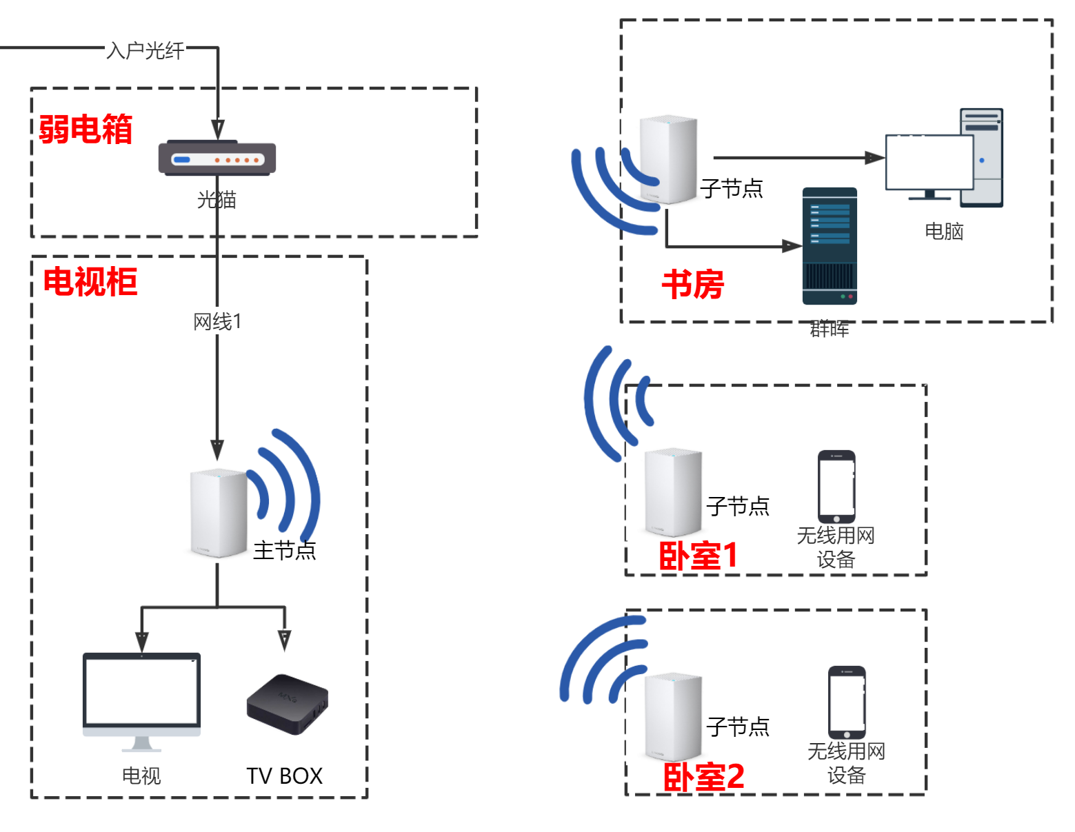 如果以上两个布线要求都不满足,弱电箱到客厅和各个房间都是一根网线,弱电箱不能同时放下光猫和主节点路由器,或者不想把主节点路由器浪费放到弱电箱,这个时候就只能用纯子节点模式组网。