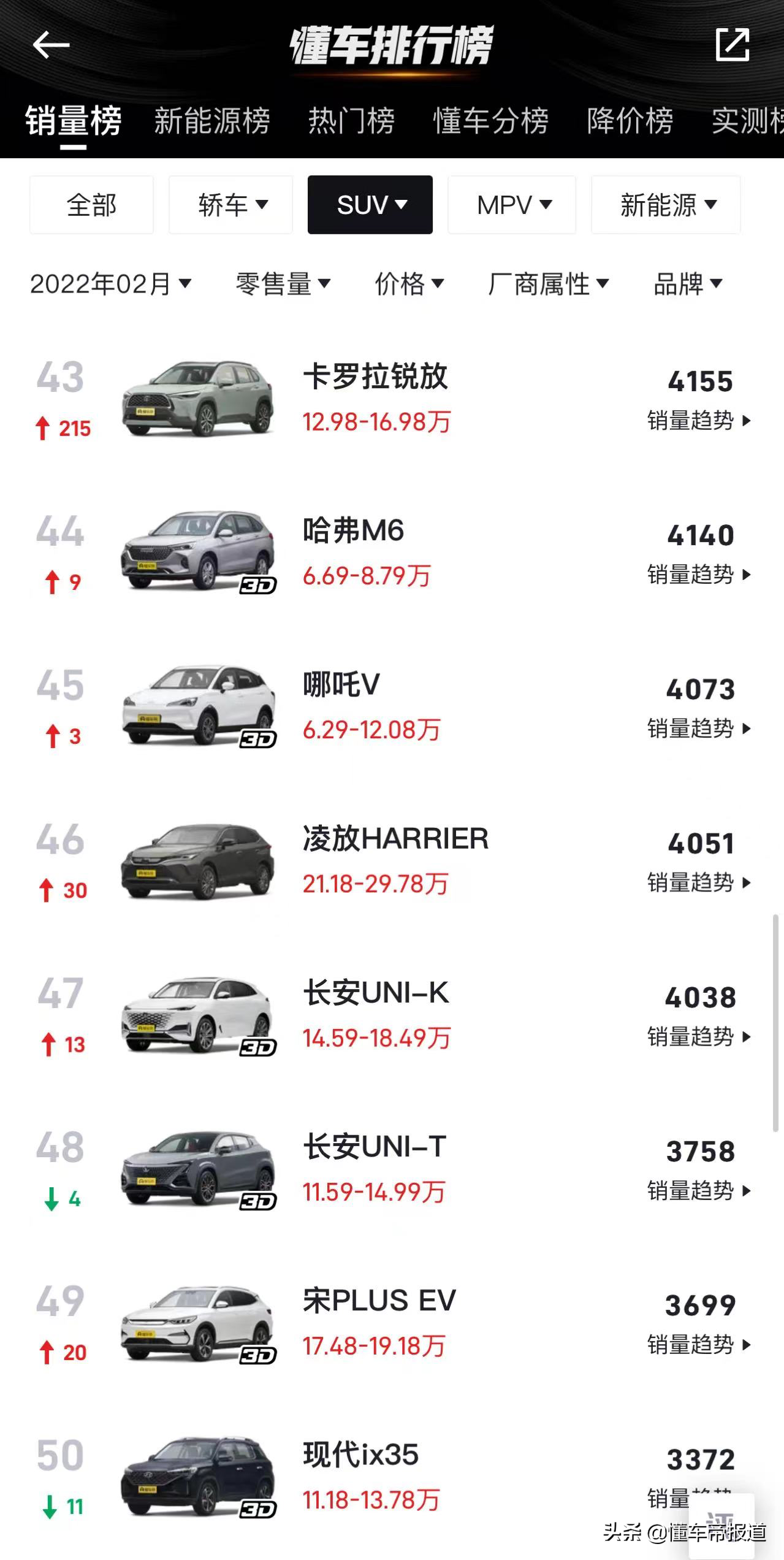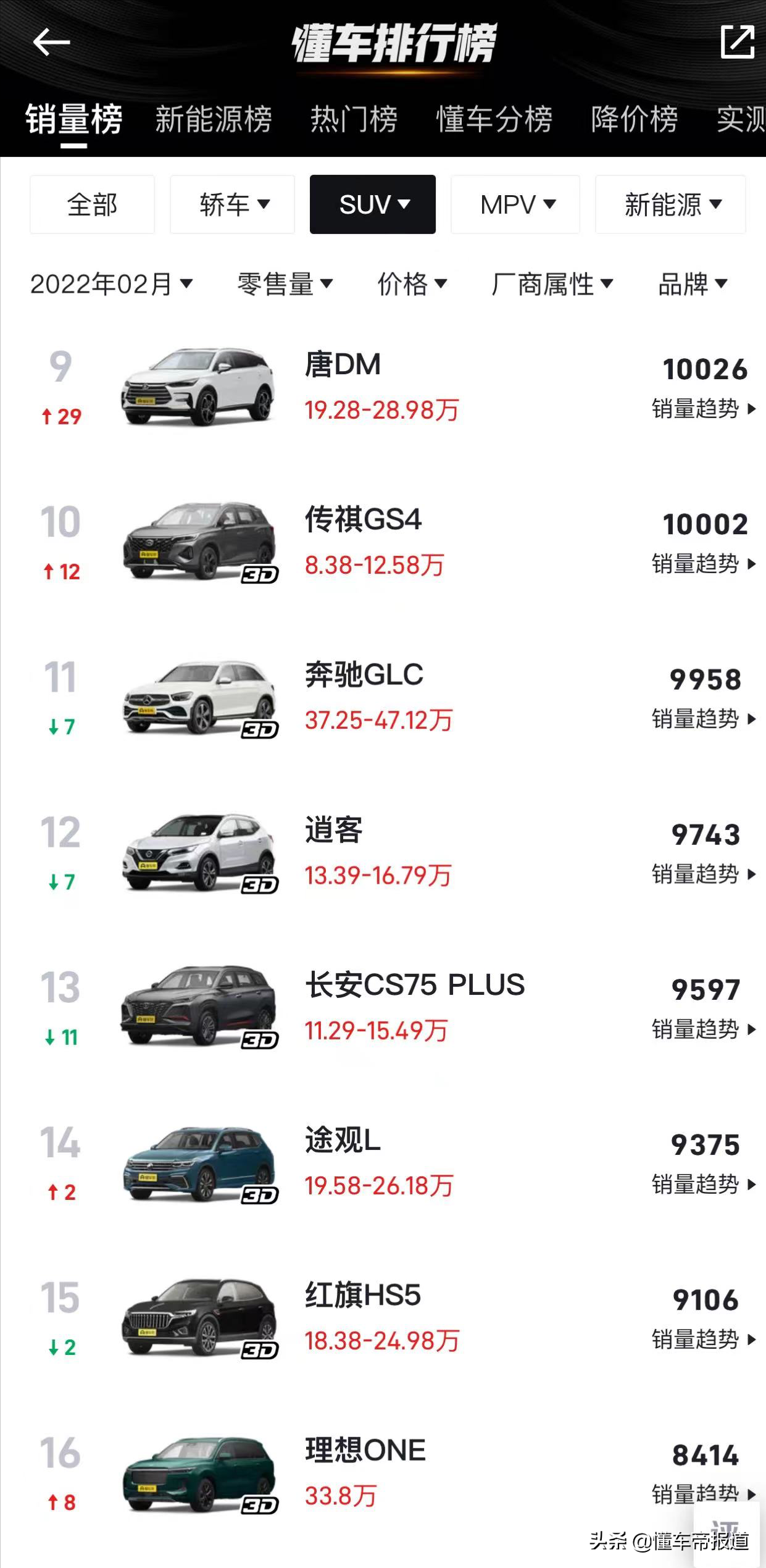 值得一提的是,比亚迪在今年开年可谓多点开花,不仅在轿车市场表现抢眼,在SUV市场同样可圈可点。除了销量排名第二的宋PLUSDM-i在本月达到19055辆外,唐DM在2月销量也超过1万辆,元PLUS在本月销量排名提升了74位。