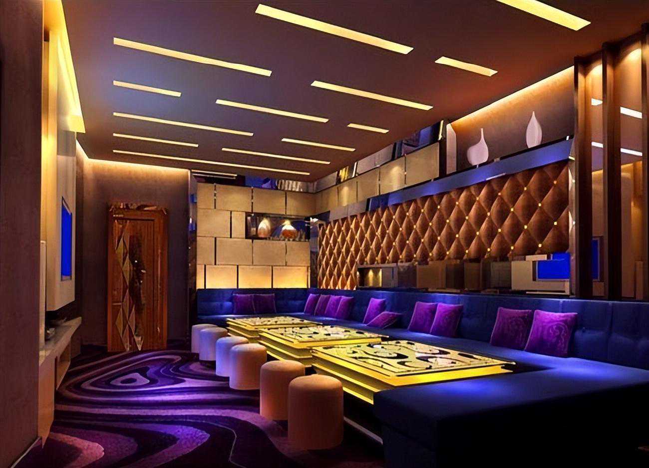 一般来说KTV灯光大概在5000—8000,对于大部分KTV包厢的天花四周有吊顶,可以在中央没吊顶的空间用吸顶灯做亮度照明。四周吊顶上方可以用LED幻彩灯带做侧光;吊顶下方可以嵌入竖立式筒灯,筒灯内可以置入智能锁色LED灯泡,气氛特别好。