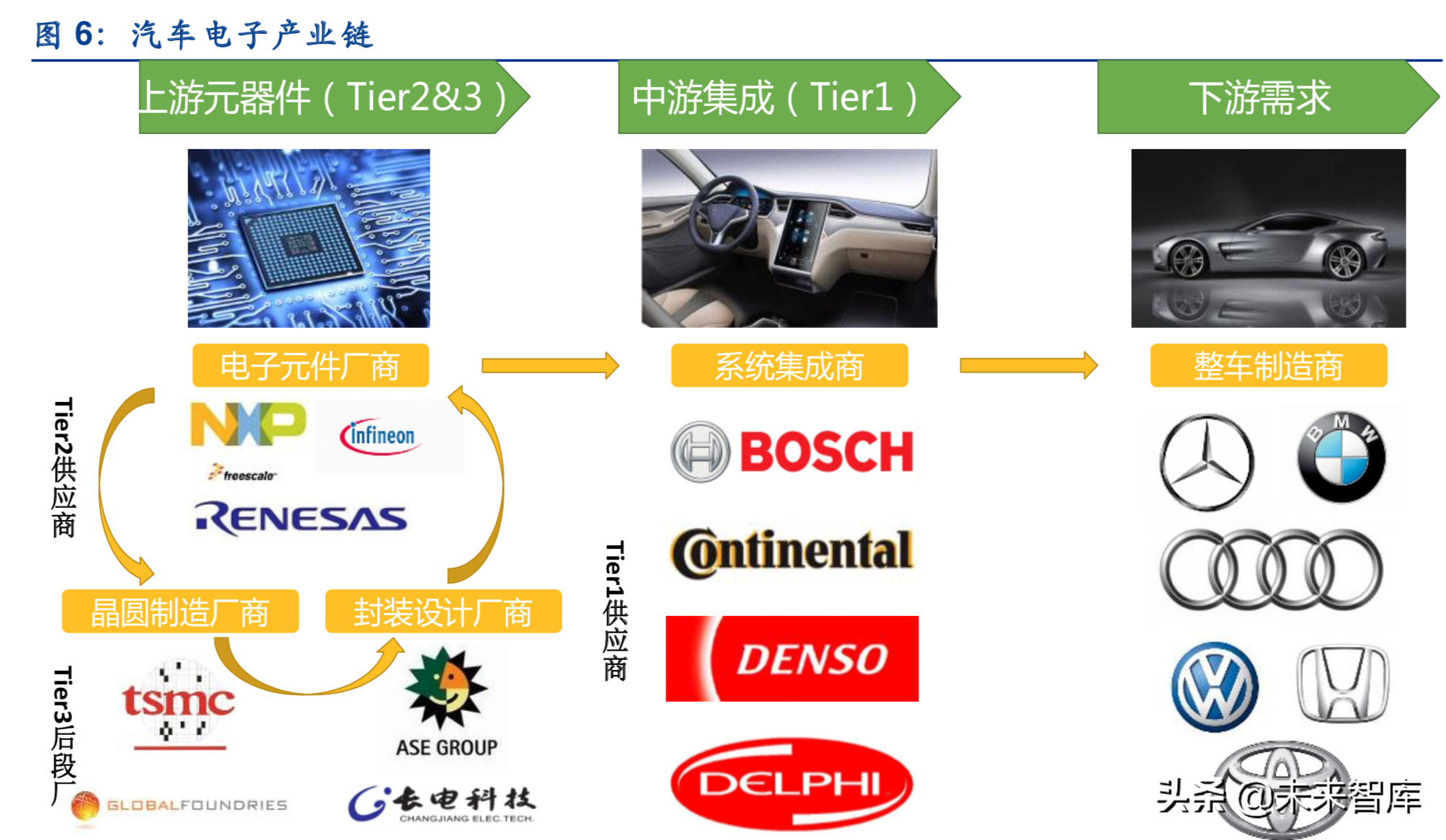 汽车电子产业链主要由三个层级构成:上游为电子元器件,中游为系统集成商,下游为整车制造厂,其中其中上游包括Tier2和Tier3,其中Tier2厂商负责提供汽车电子的相关核心芯片及其他分立器件,主要包括如恩智浦、飞思卡尔、英飞凌、瑞萨半导体等IC设计厂商以及如车载大功率二极管厂商分立元器件厂商,Tier3后段厂为Tier2厂商提供代工及封测服务,包括TSMC、GlobalFoudries等;中游汽车电子的系统集成商Tier1主要进行汽车电子模块化功能的设计、生产及销售,具体包括博世、大陆、德尔福、日本电装等公司;下游则为整车厂(OEM)及维修厂(AM)。