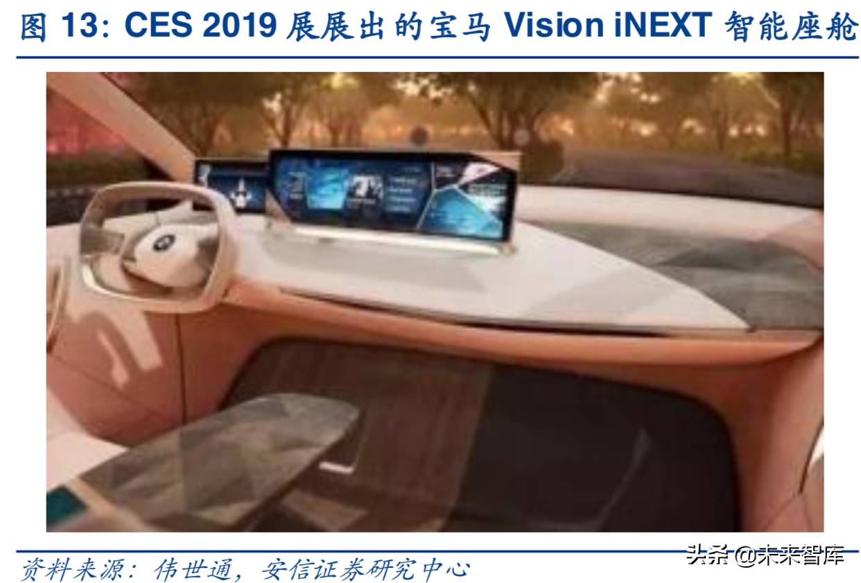 未来的智能驾驶舱可从2019CES展中窥见一斑。奔驰、宝马、丰田、拜腾等车企均在2019年1月举行的CES展中展出搭载新概念智能驾驶舱的车型。其中,奔驰发布了全新CLA车型,双10.25英寸大屏的全液晶仪表+中控屏上搭载了全新的MBUX人机交互系统,这套MBUX具备学习能力,可使用23种语言的语音到意义和自然语言理解来提供会话智能。宝马展示的VisioniNEXT车型搭载了一大一小的两块屏幕,预计2021年上市,届时宝马将携手阿里巴巴将天猫精灵智能语音助手整合并推出。丰田ACES概念舱配备独特的“体型和姿势检测系统”,具备强大的感知能力,它使用摄像头、座椅传感器检测乘客的眼睛位臵、体型大小和姿势以便座椅和安全带自动调整,若检测到驾驶员正昏昏欲睡,还能利用音乐和振动帮助驾驶员保持清醒。拜腾首款BYTONM-Byte预计于19年年底实现量产,拜腾的多屏融合是其最大亮点,48共享全面屏用非常直观的方式显示车辆和驾驶信息以及丰富的通讯、娱乐等内容。