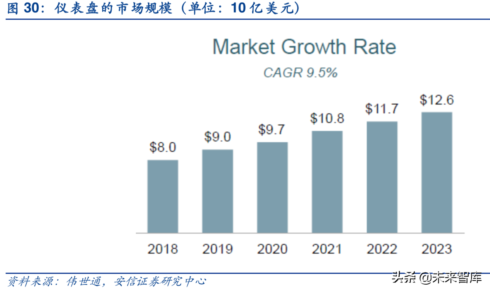 2018年市场规模80亿美元,2020年有望达97亿美元。根据伟世通,2018年仪表盘市场规模约为80亿美元,随着全液晶仪表的普及,渗透率有望持续提升带动销量增长,全液晶仪表盘向低端车型渗透将促使其价格下探,综合来看2018-2023年市场规模CAGR约为9.5%,至2020年市场规模为97亿美元,至2023年市场规模可达126亿美元。