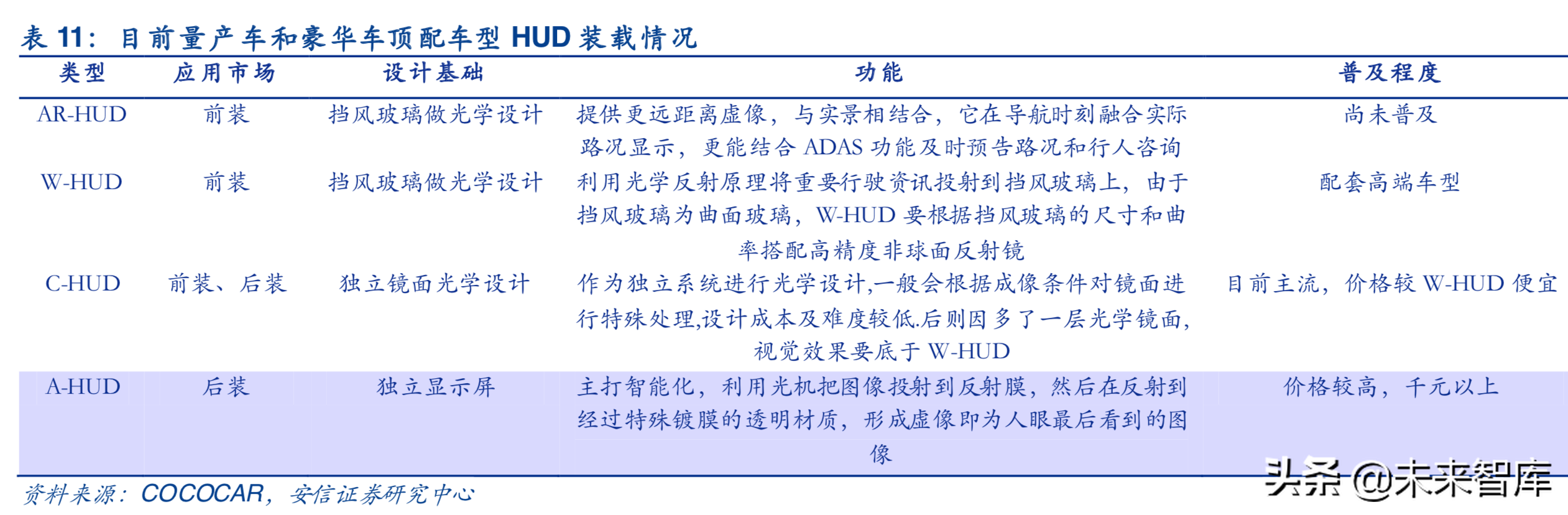 HUD即抬头显示器,是HeadsUpDisplay的缩写,是目前普遍运用在航空器上的飞行辅助仪器以降低驾驶员低头查看仪表的频率,避免注意力中断以及丧失对状态意识的掌握。在大尺寸中控屏尺寸备受追捧的当下,车载显示产生了分散驾驶员注意力的安全隐患,车载HUD应运而生,最早出现在80年代末,随即2001年、2004年通用、宝马分别推出彩色HUD,随着技术逐渐成熟,HUD目前已普遍运用在豪华车上,部分日常家用汽车亦有装载。