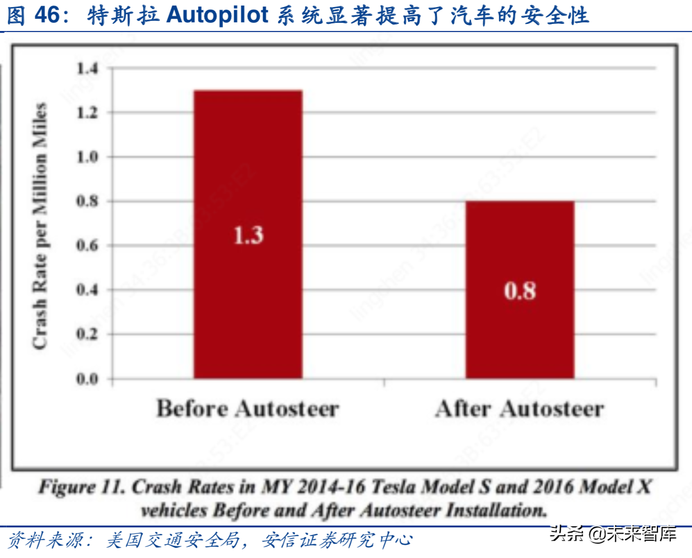智能化创新方向——自动驾驶。特斯拉在2015年10月通过软件更新的方式引入了自动驾驶,主要包含两个功能:主动巡航定速(TACC)和自动巡航(Autosteer)。前一个模式会让车辆在驾驶员设定的速度下自动行驶,当检测到前方车辆时,它还会自动减速保持合适的距离;后面的模式则使用摄像头、激光雷达探测路标和前方车辆,使特斯拉能够自动行驶在道路中间。尽管产业界对于特斯拉在媒体上的过度宣传自动驾驶的能力还存在不少质疑,但不可否认的是,通过引入自动驾驶系统,确实显著提高了汽车的安全性。根据,美国交通安全局的分析,2014年到2016年,所有装备了自动驾驶功能的特斯拉ModelS和ModelX发现,安装自动驾驶后,造成弹出安全气囊的车祸的平均数量,已经从每100万英里1.3起,降低到每100万英里0.8起。车祸发生率降低了近40%。