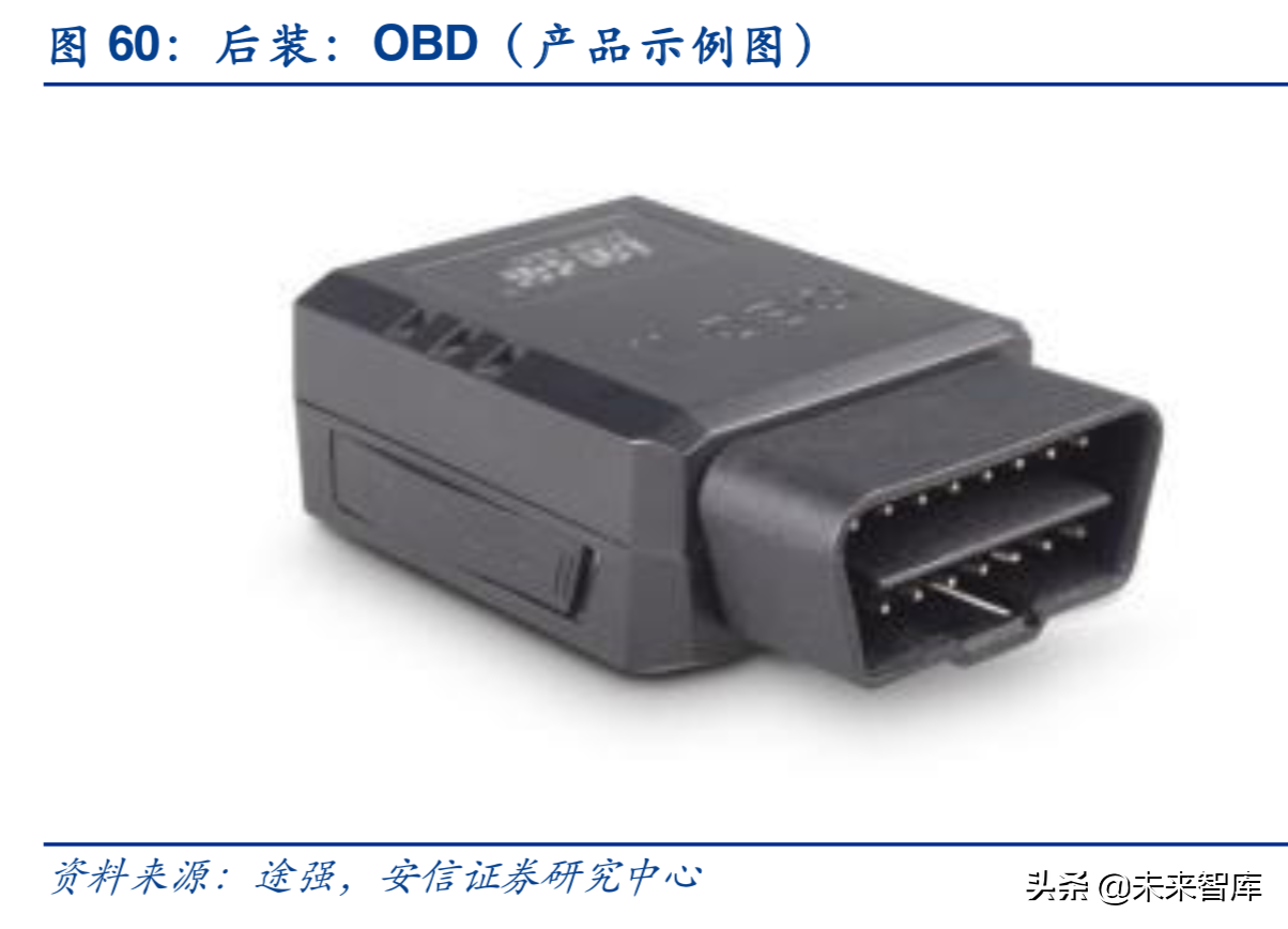 汽车终端的后端设备以OBD(On-BoardDiagnosis车载自诊断系统)为代表,用来监控发动机的运行状况和尾气后处理系统的工作状态。面向保险行业的UBI(UsageBasedInsurance,基于使用的保险)也开始广泛运用。运营商和TSP(TelematicsServiceProvider)服务商是后装市场的主要需求方。运营商通过“终端+流量”打包销售的方式收取服务费,未来OBD等产品有望在运营商转型盈利模式的驱动下迎来更大发展。