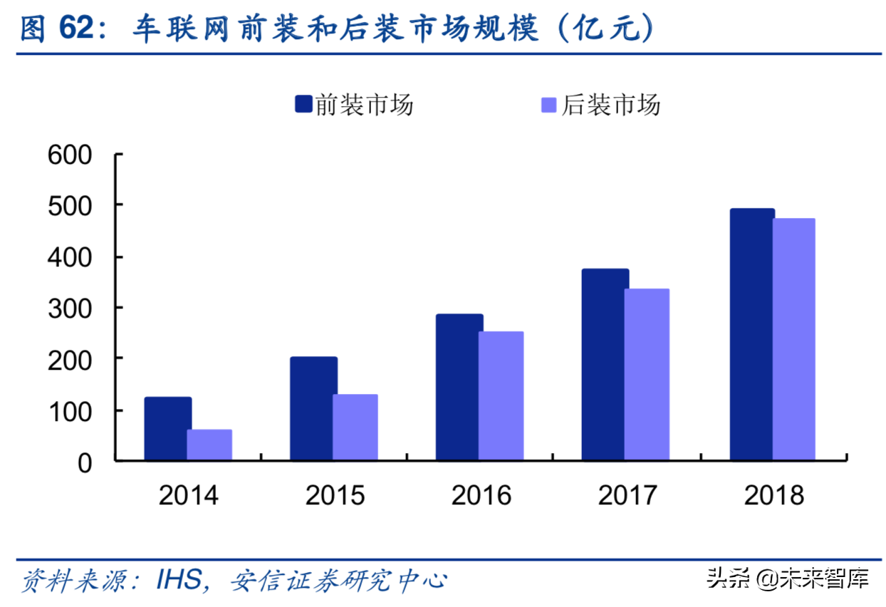 总体来看,前装市场空间略高于后装市场,但是相差不大。根据IHS的统计,2018年国内前装终端销售量约为500万台,后装销售量也在450万台以上。从产业链成熟度和竞争格局的角度看,我们看好前装市场在政策和需求双重驱动下的发展空间。根据工信部《新能源汽车生产企业及产品准入管理规定》,自2017年1月1日起对新生产的全部新能源汽车安装车载控制单元,对于已销售的新能源汽车产品,整车企业要按照国家标准要求免费提供车载终端、通讯协议等相关监测系统的升级改造服务。随着车联网的逐步渗透,以及新能源汽车企业对车辆电池和整车状态信息的实时需求,佐思产研数据指出,预计全球T-box市场在2020年将达到15亿美元的市场规模,年复合增长率约50%,产业前景十分良好。