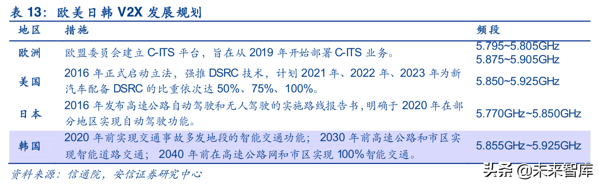 目前,欧美日韩均已在5900MHz附近为V2X划分频谱资源,我国工信部确定在5905-5925MHz频段发展车联网,有利于V2X全球产业链的合作协同。同时规划的频段达到20MHz,远高于欧美日韩,体现了我国大力发展车联网产业的决心。