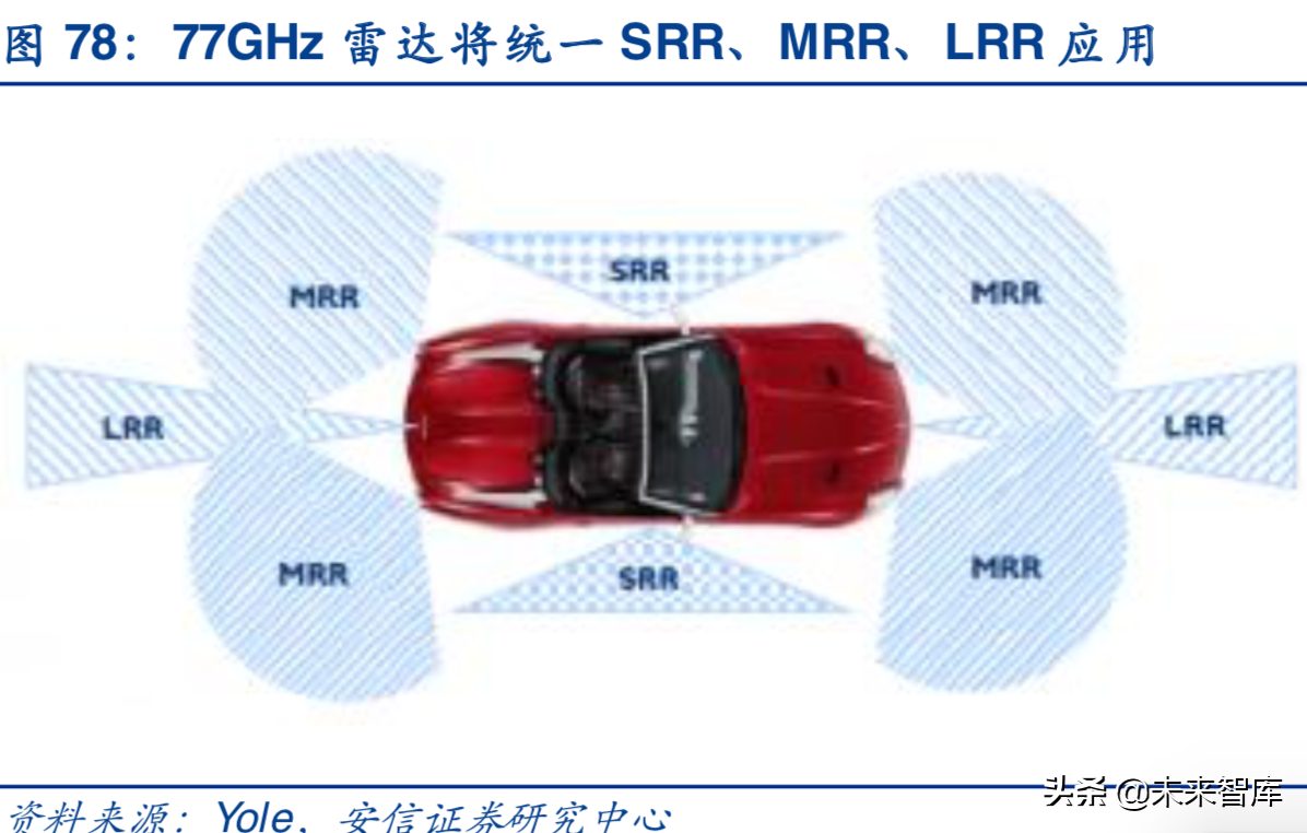 汽车雷达系统可分为三个子类别:短程(SRR),中程(MRR)和远程(LRR)。每种都有不同的应用,远程(超过100米)通常用于前向碰撞避免,而短程和中程(100米以内)用于盲点检测、停车辅助系统、预碰撞警报、车道偏离警告或停停走走应急系统。