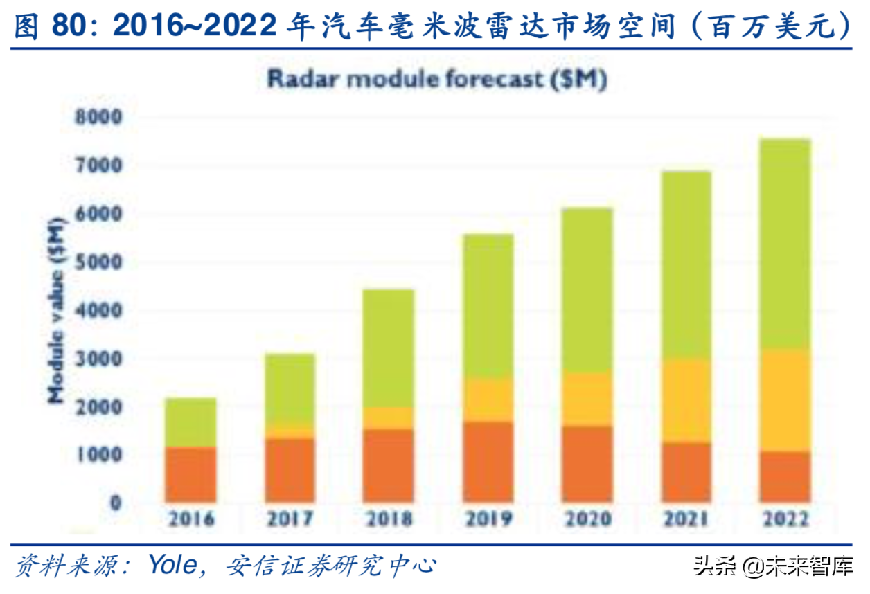 目前,24-29GHz频段用于大多数短距离雷达,然而,由于此频率范围的功率输出存在许多规定限制,将来可能被完全淘汰。而77GHz雷达具有更广的距离覆盖范围(得益于其“全功率”模式)和更大的可用带宽,从而将距离分辨率和精度提高了20倍,同时由于频率更高,因此具备相比于24GHz更小的外形尺寸和更高的速度分辨率。市场空间看,在自动驾驶技术的推动下,Yole预计到2022年汽车毫米波雷达模块的市场空间将达到75亿美元,6年CAGR将达到25%。