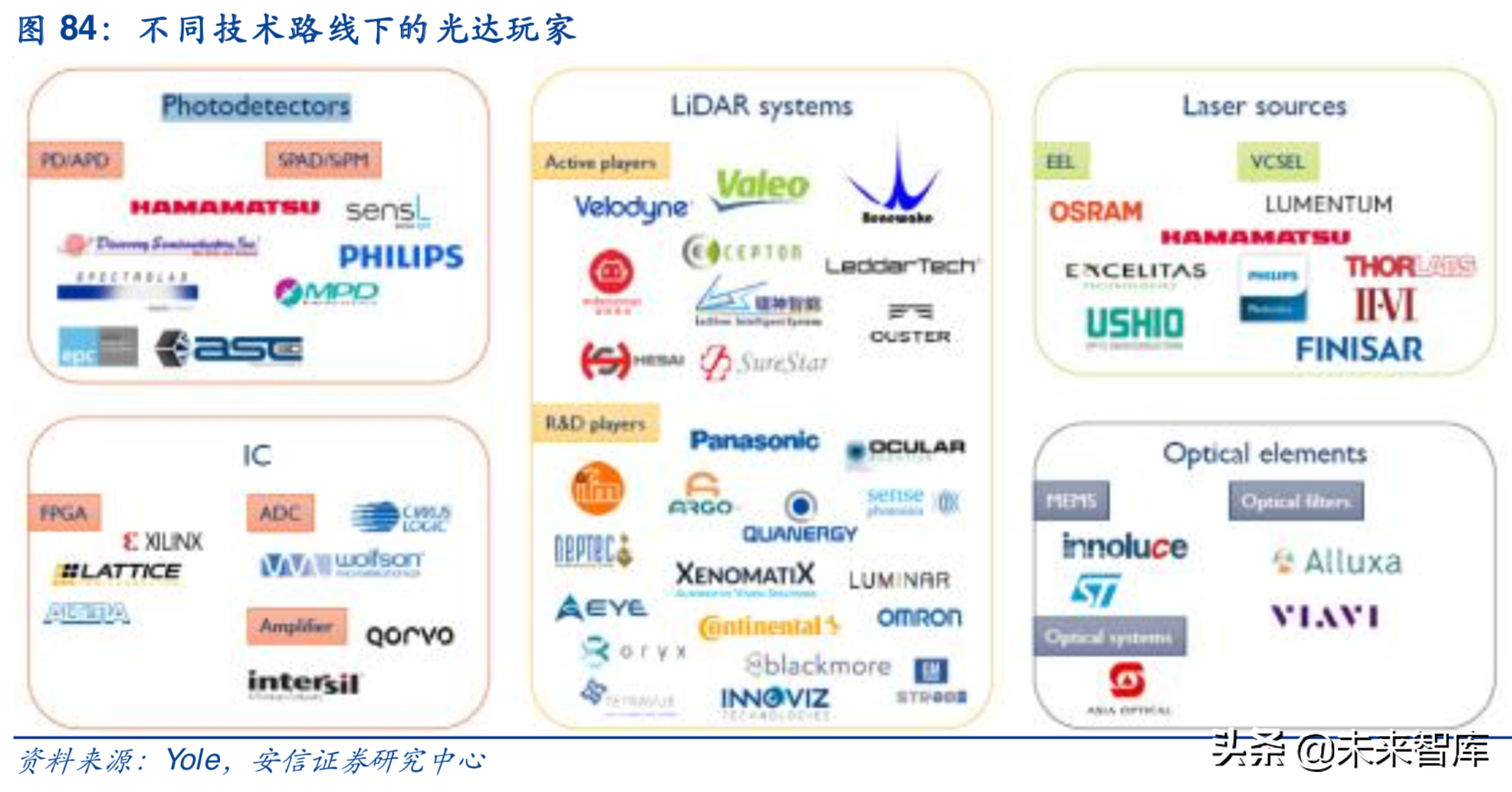 在技术方面,大多数现有产品使用波长在830-940nm之间的激光束进行机械扫描。MEMS扫描仪有望成为汽车LiDAR的下一代发展方向,体积更小,更便宜。Quanergy公司提出了一种源于光纤通信技术的光学相控阵方案,成本低、体积小、安全性高。除此之外,Continental和Xenomatix提出了闪光光达(FlashLiDAR),整个场景同时被照亮而没有移动部件。