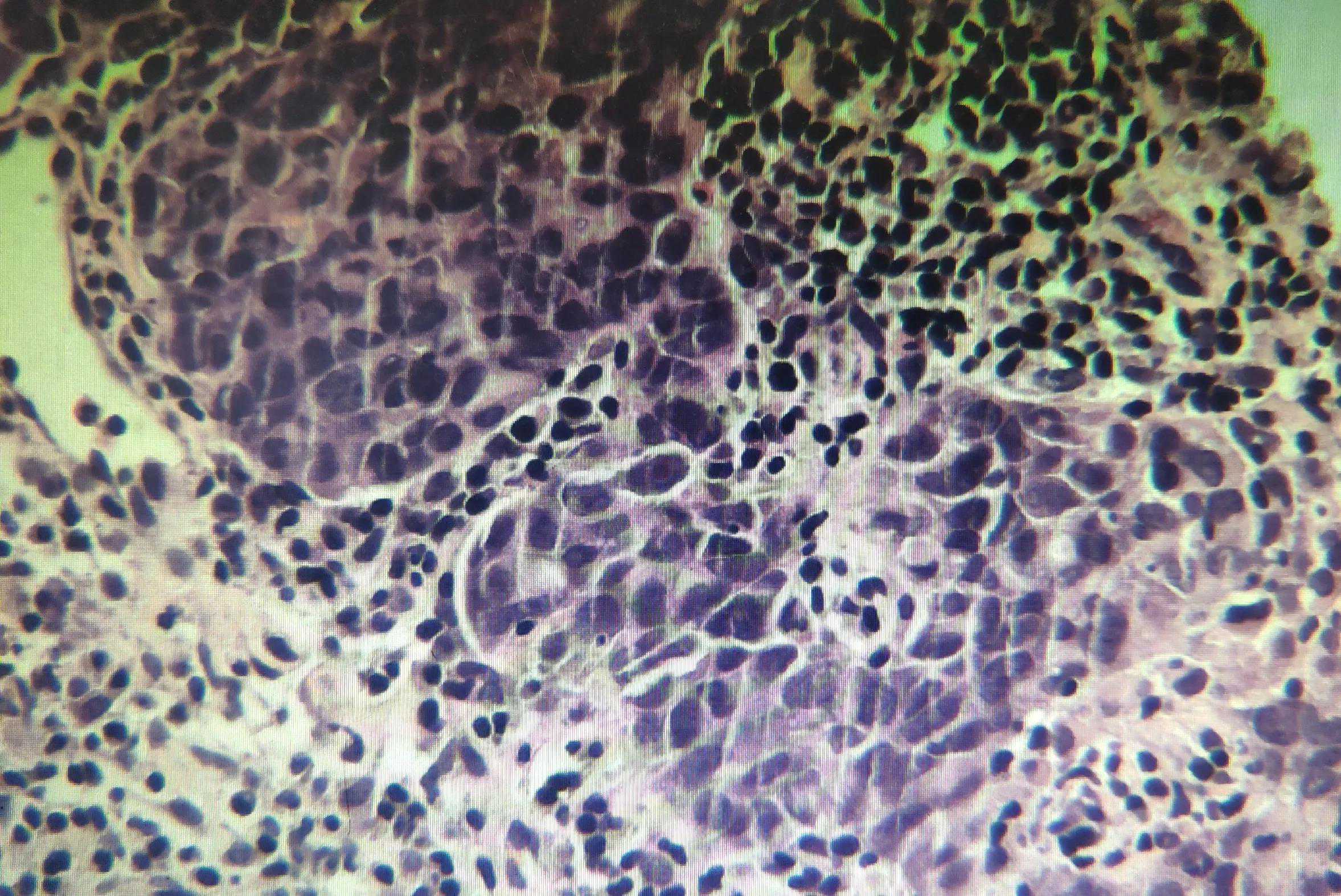 病理:多条坏死物,纤维组织中见高度异型上皮细胞巢,考虑为转移性低分化癌。
