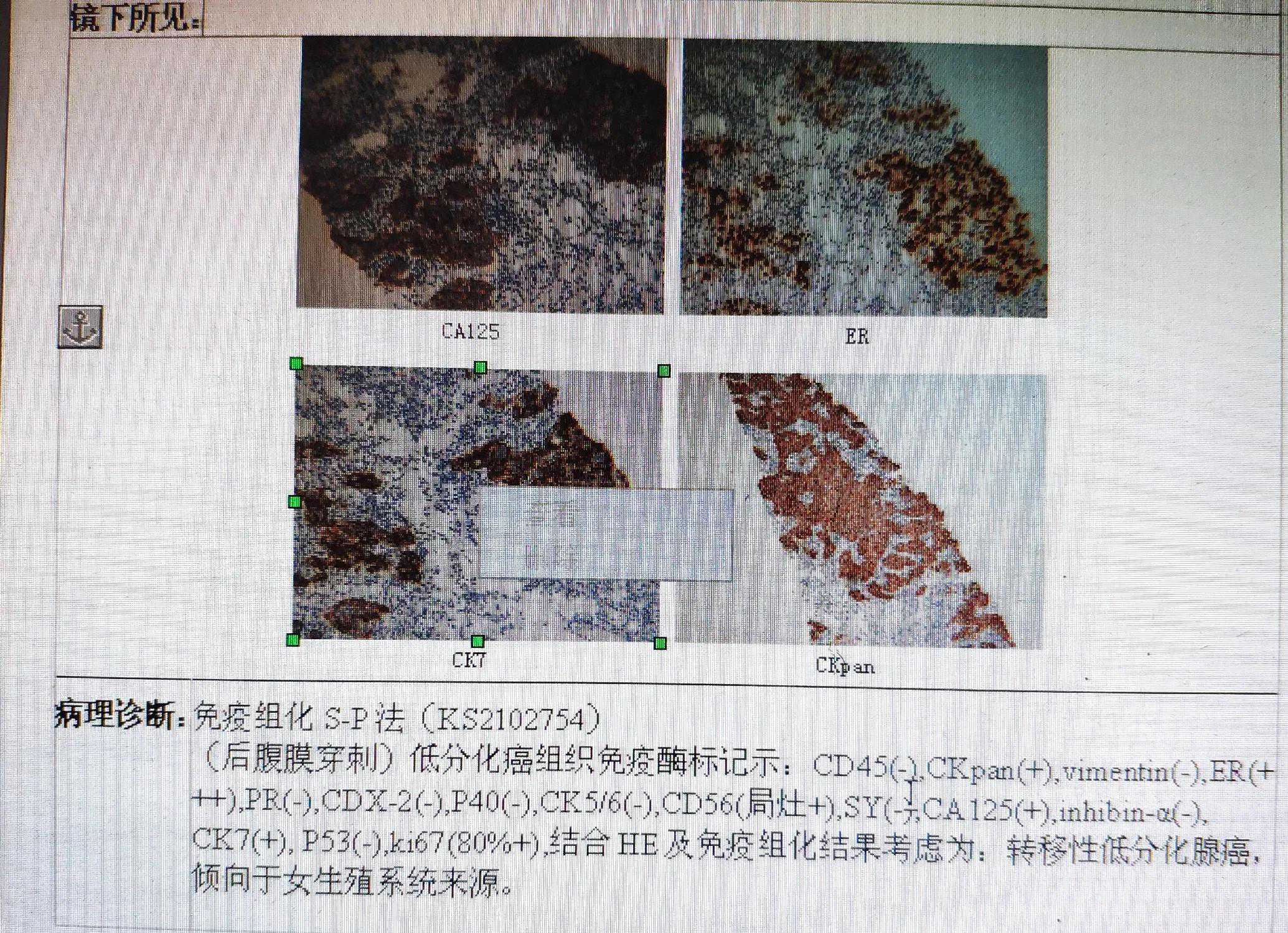 虽然明确了转移性腺癌,但是原发灶并不确定,虽然免疫组化有提示,但影像学资料在盆腔并没有提示有明确的病灶。