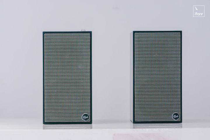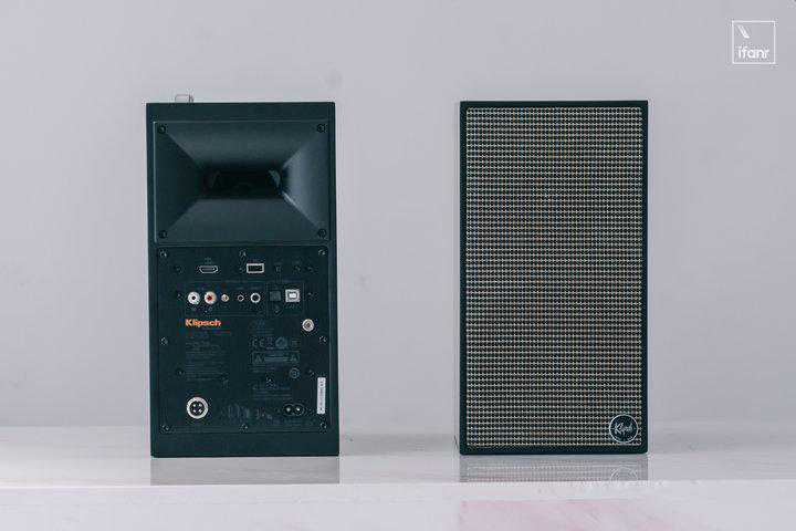 音箱的滤声网采用磁吸设计,拆卸方便。整个机身都很干净,而Klipsch的Logo,左右两个音箱都放在了滤网的右下角。