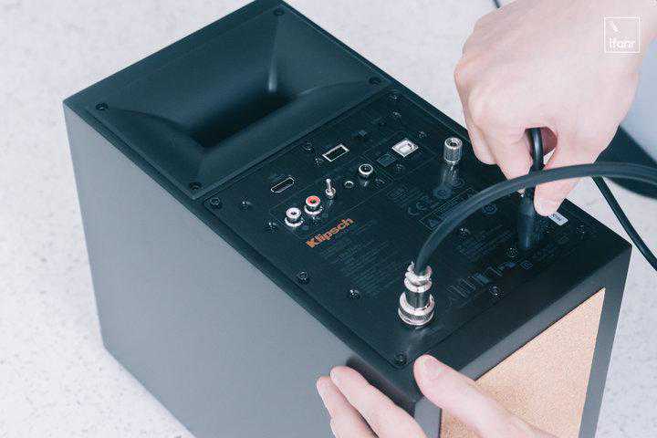 KlipschTheFives主要的接口都集中在右边箱体后面,左右箱体连接依旧以一条四针的音频线连接。接口里面有辨别方向的防呆设计,接上之后可以通过面的螺母拧紧。