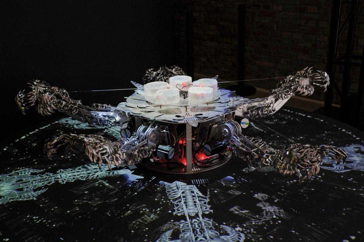 展览中,滕家琪通过脊椎骨与机械体的复合形态模糊生命的定义,以技术悲观主义的语境去反思人机界限模糊的时代里,人与机器之间的关系。