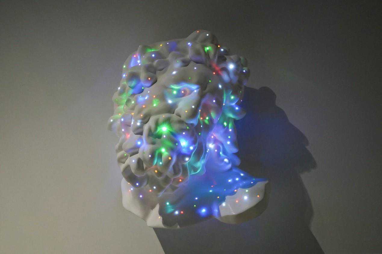 张增增《轻抚你的脸》以古希腊雕塑《拉奥孔》头像为载体,以人类内心深处的表达,诠释了古希腊神话经典下的动态瞬间。