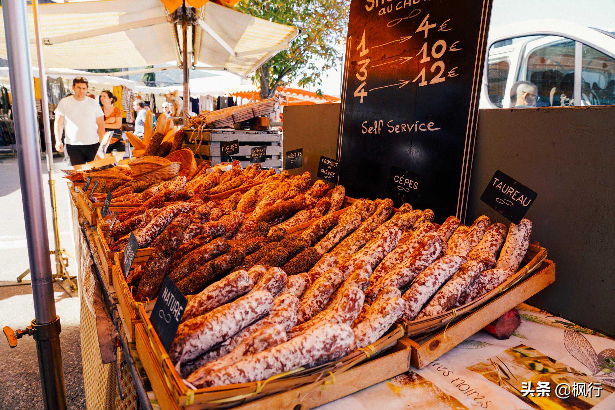 恰逢周五,小镇山脚下平坦的道路上,聚集了很多市集摊位。出售在普罗旺斯最最普通的商品,香肠、橄榄、奶酪、丝巾。
