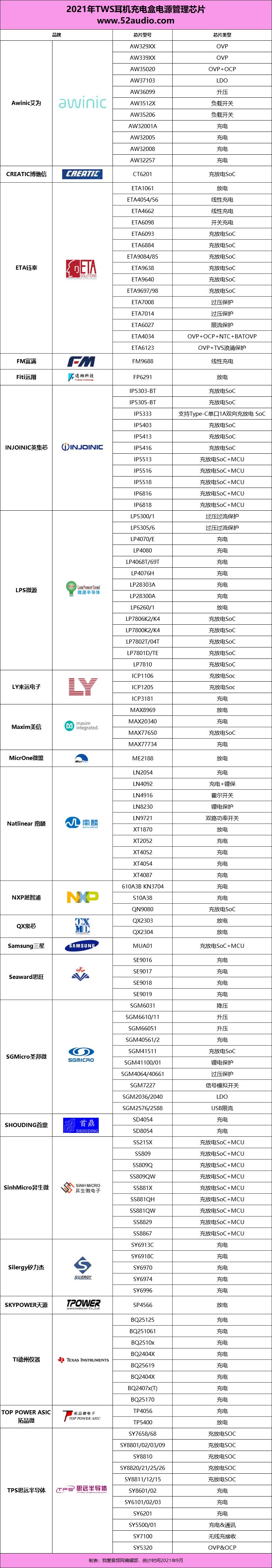 此前我爱音频网为大家汇总整理了2021年TWS耳机蓝牙音频SoC,此次再来为大家分享一下2021年TWS耳机充电盒电源管理芯片,包含了23家电源芯片厂商推出的138款电源管理芯片产品,下面来看看都有哪些产品使用了哪些充电盒电源管理芯片吧~