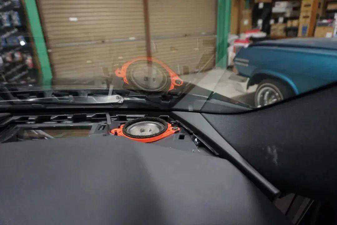 原装高音安装在门镜内侧,声丽创音的SD-25T高音喇叭太大装不下。改装技师在仪表盘原装中音喇叭安装位,制作了一个固定支架换装上去,毫无违和感。