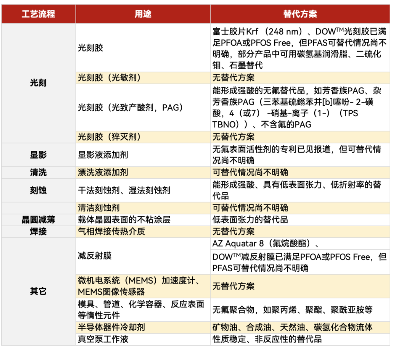 根据SGS的报告显示,光敏剂、猝灭剂、漂洗液添加剂、清洗刻蚀剂、气相焊接传热介质、微机电系统(MEMS)加速度计、MEMS图像传感器等用途的PFAS目前无替代方案。