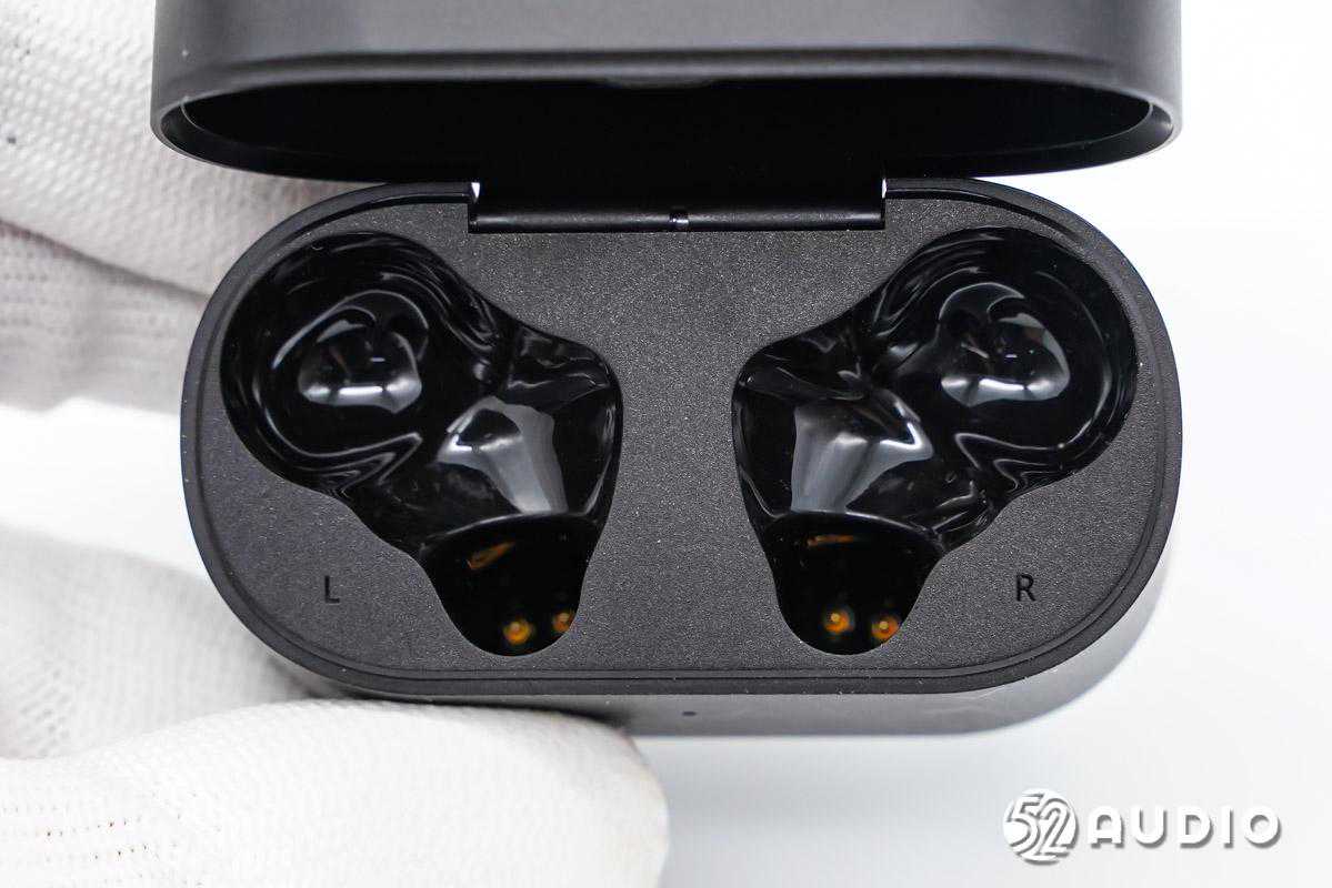 充电盒座舱内部结构一览,雕刻有L/R左右标识,便于用户快速区分。为耳机充电的金属顶针位于耳机柄座舱底部。