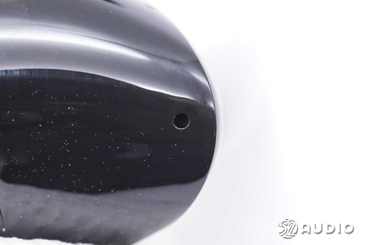 耳机内侧外观一览,前腔采用了磨砂质感,尾塞采用了倾斜的抗风噪设计,内部凹槽设置麦克风拾音孔。