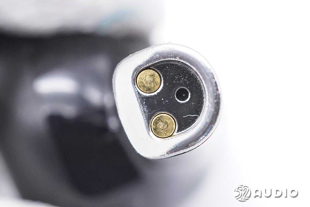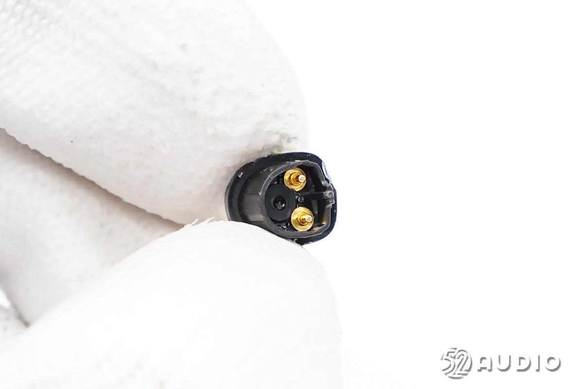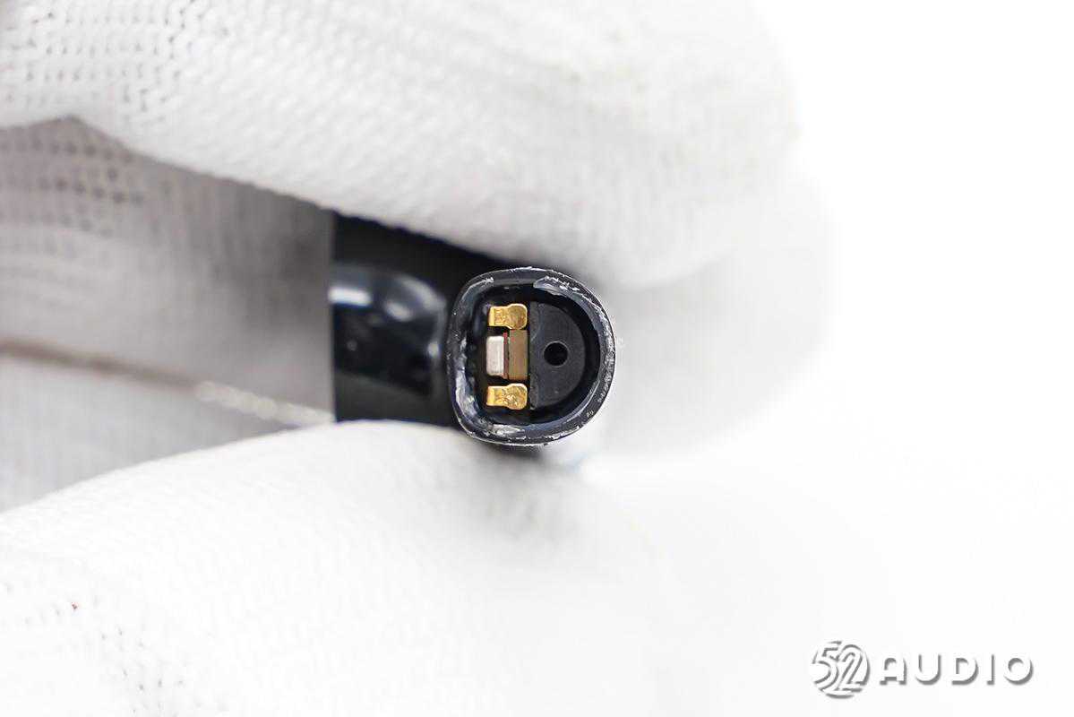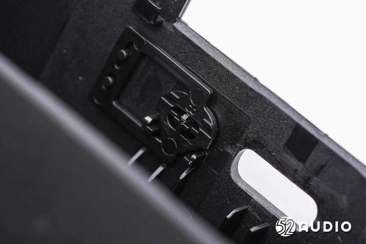 尾塞内侧结构一览,设置有为耳机充电的金属连接器和麦克风声学密封结构。