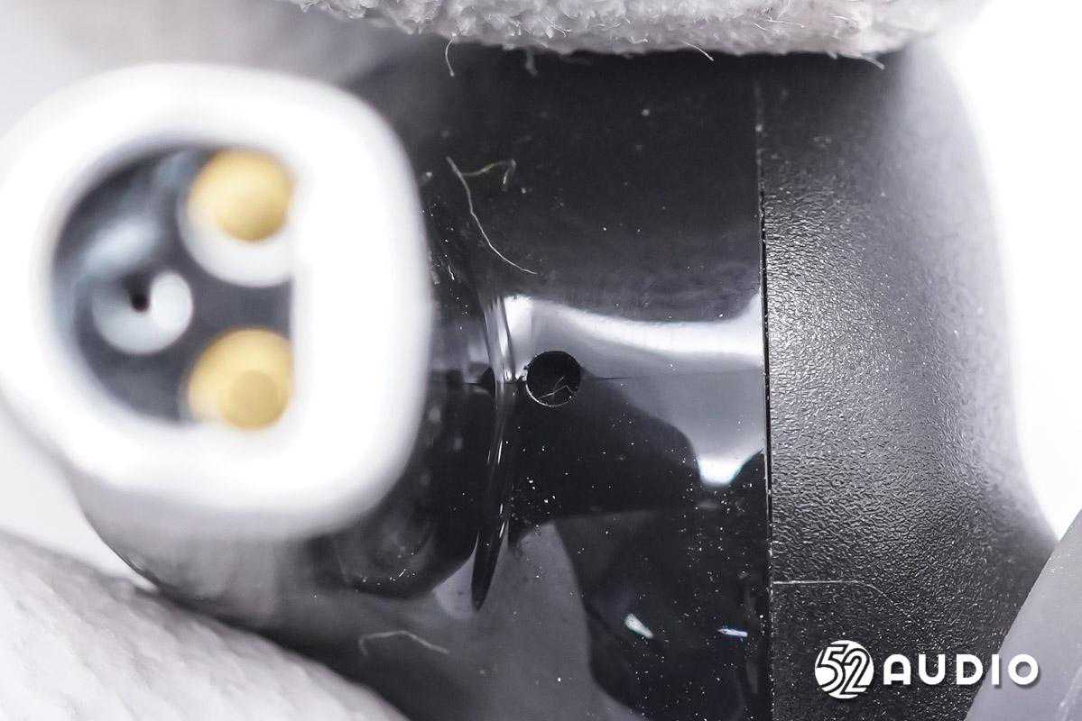 耳机底部为耳机充电的金属触点和通话麦克风拾音孔特写。