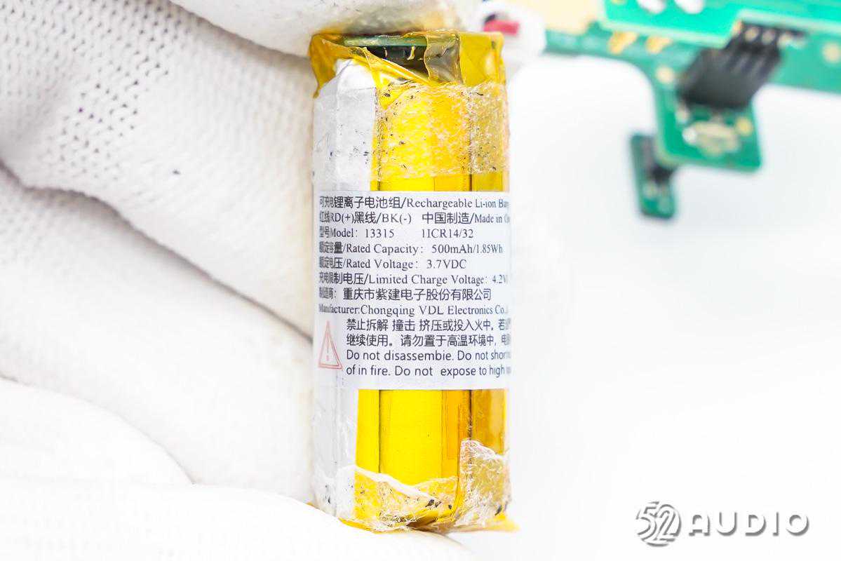 充电盒内置可充电锂离子电池组型号:13315,额定容量:500mAh/1.85Wh,额定电压:3.7V,充电限制电压:4.2V,制造商:重庆市紫建电子股份有限公司。