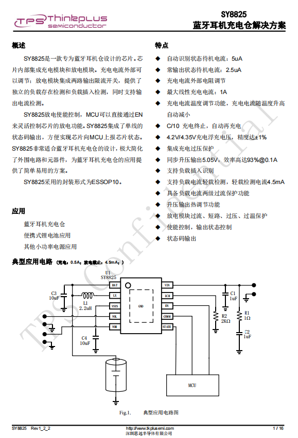 思远半导体SY8825是一款专为蓝牙耳机仓设计的芯片。芯片内部集成充电模块和放电模块。充电电流外部可以调节;放电模块集成两路输出限流开关,提供了独立的负载存在检测和负载插入检测,同时支持输出电流检测。SY8825采用的封装形式为ESSOP10。