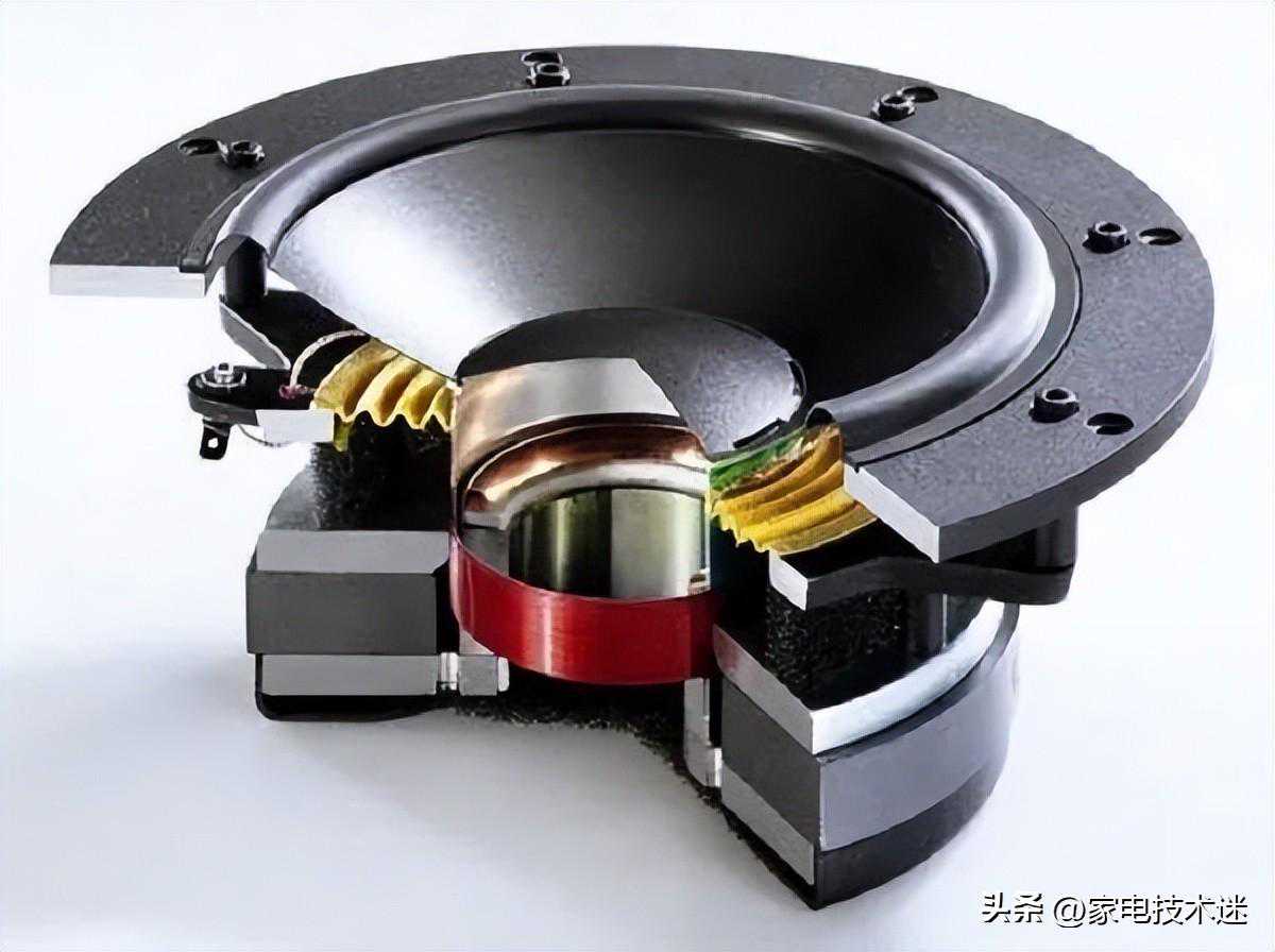 6、音圈:由音圈骨架与线圈组成,作用是完成电能到机械能的转化;即有电流经过音圈时,根据电磁效应,会产生磁场,音圈的磁场与磁铁的磁场相互作用,两者磁场方向相同或相反,导致音圈在T形铁和磁铁组成的缝隙中是前进还是后退,从而带动锥盆(振膜)和弹波振动;锥盆振动驱动空气形成压力波、空气振动被传播出去,这种震动传到人耳、然后被人“听到”。