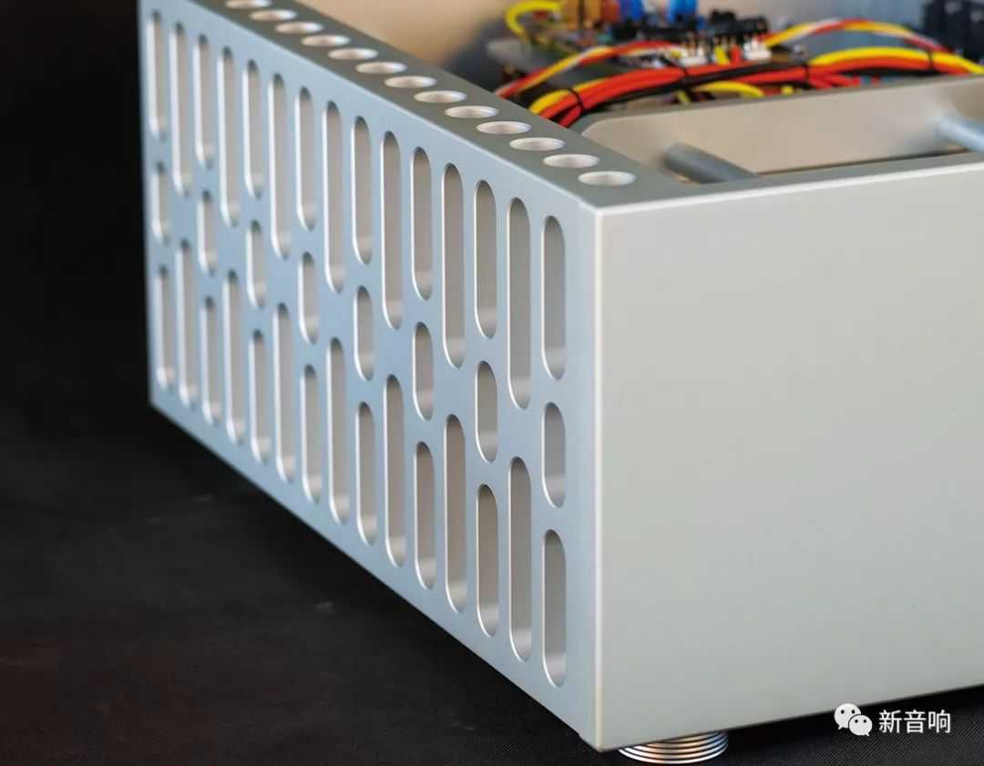 ●超重全铝机箱。目前音响厂家普遍面临的问题是加工厂嫌数量太少不愿接单,尤其是CNC数控机床加工,方光豪说AM1000这套2分体的功放,未加工的铝合金块重达200公斤,加工后重量仍有160公斤,这还不包括加入巨大电源变压器与输出变压器的重量。而加工这种大块头的CNC可不是到处都有,你可以说AM1000的外观缺少独创性,但不得不承认最终成品触感一流,边缘锐角与表面平滑度已臻国际一流水平,方光豪果然不简单!AM1000两部单声道后级完全对称,机箱使用6061-T6航天级厚铝板打造,CNC车床精密铣削的圆孔散热片美观实用,全机没有可见的装配螺丝,如此加工质量可以完美满分过关,国内尚无其他音响厂家可以做到。